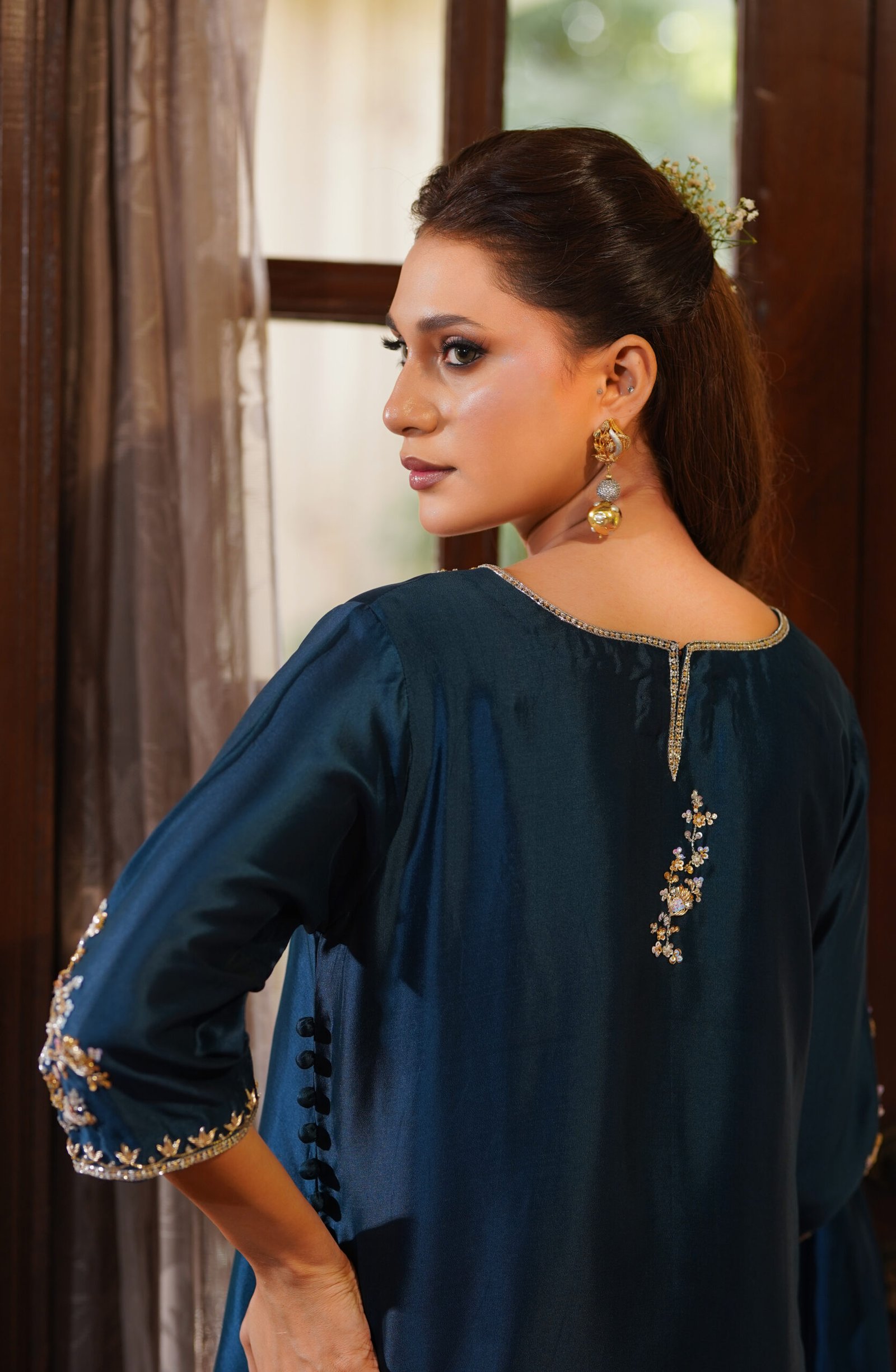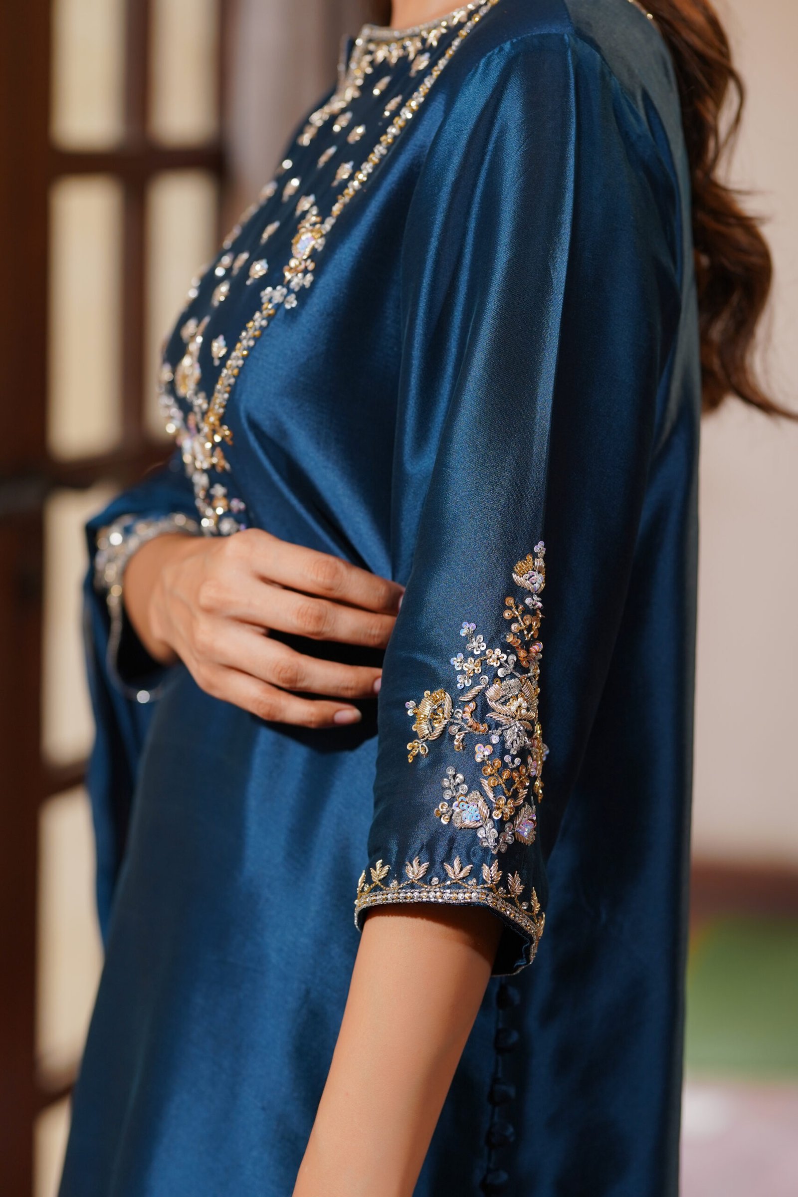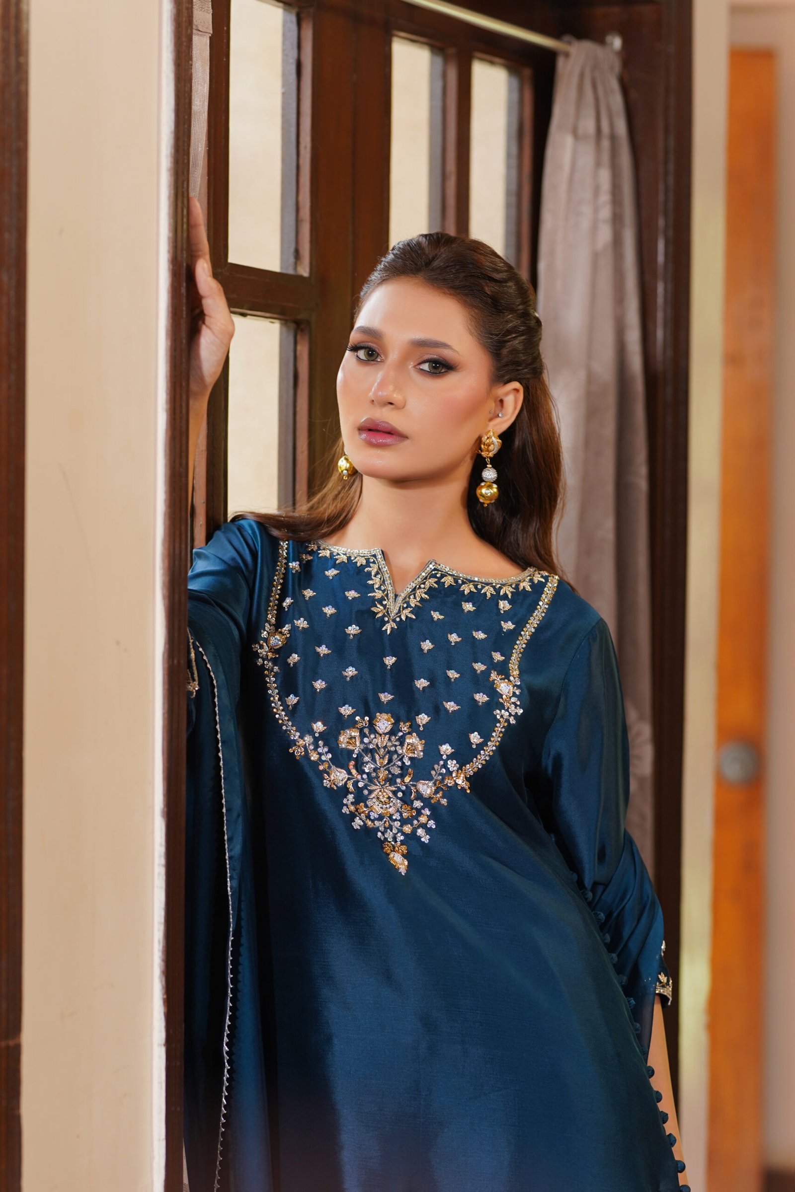 Festive and radiant, Azura features detailed handwork across the neckline and tailored accents on its dupatta. A balance of structure and embellishment, this piece is designed to shine at celebratory occasions.