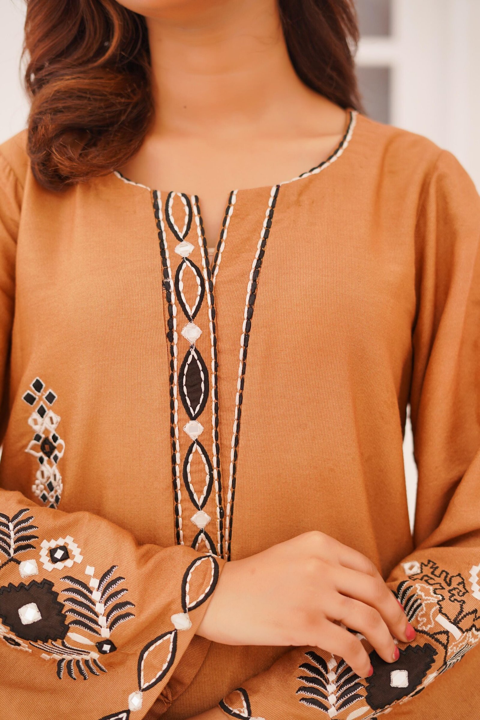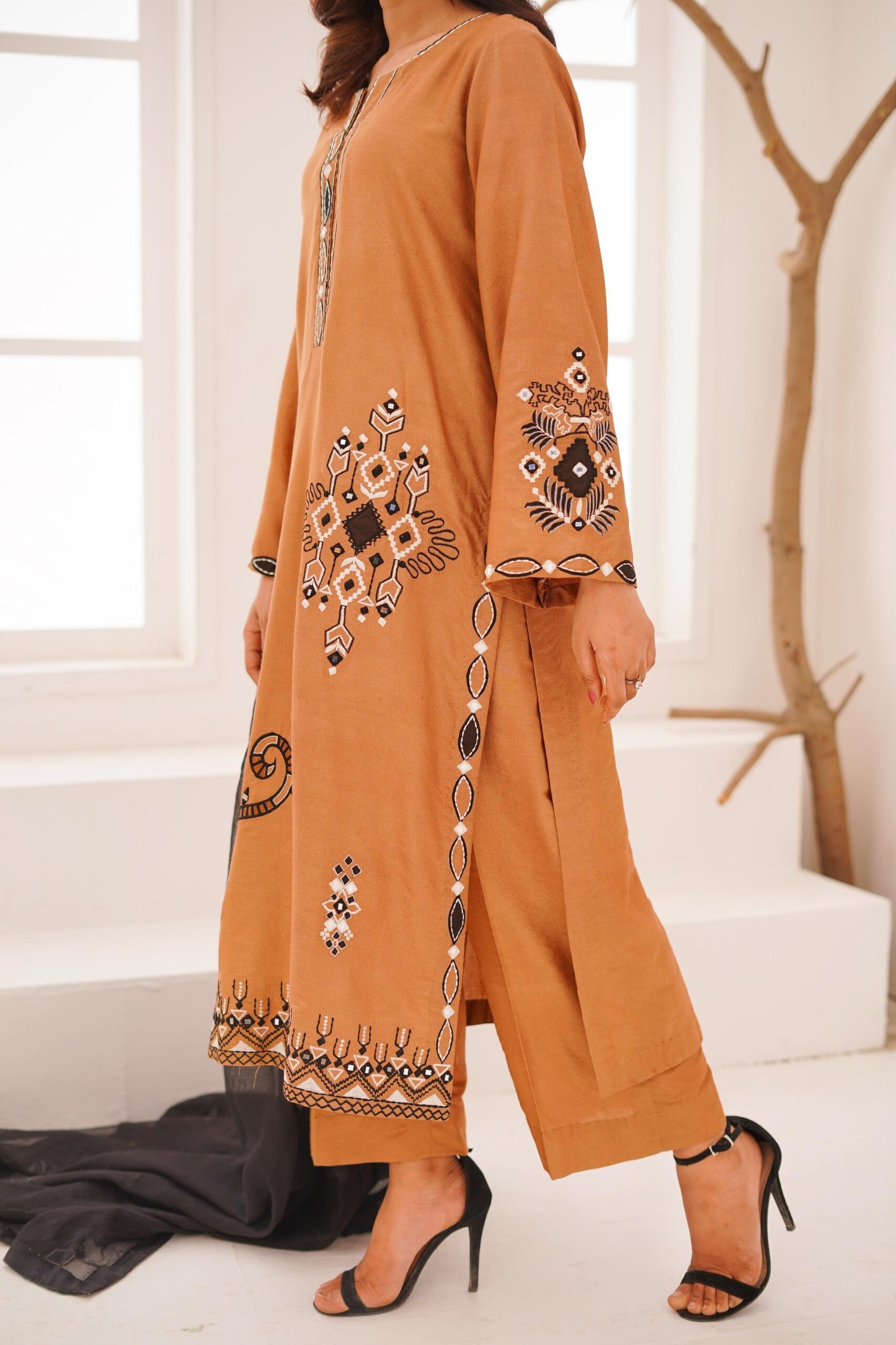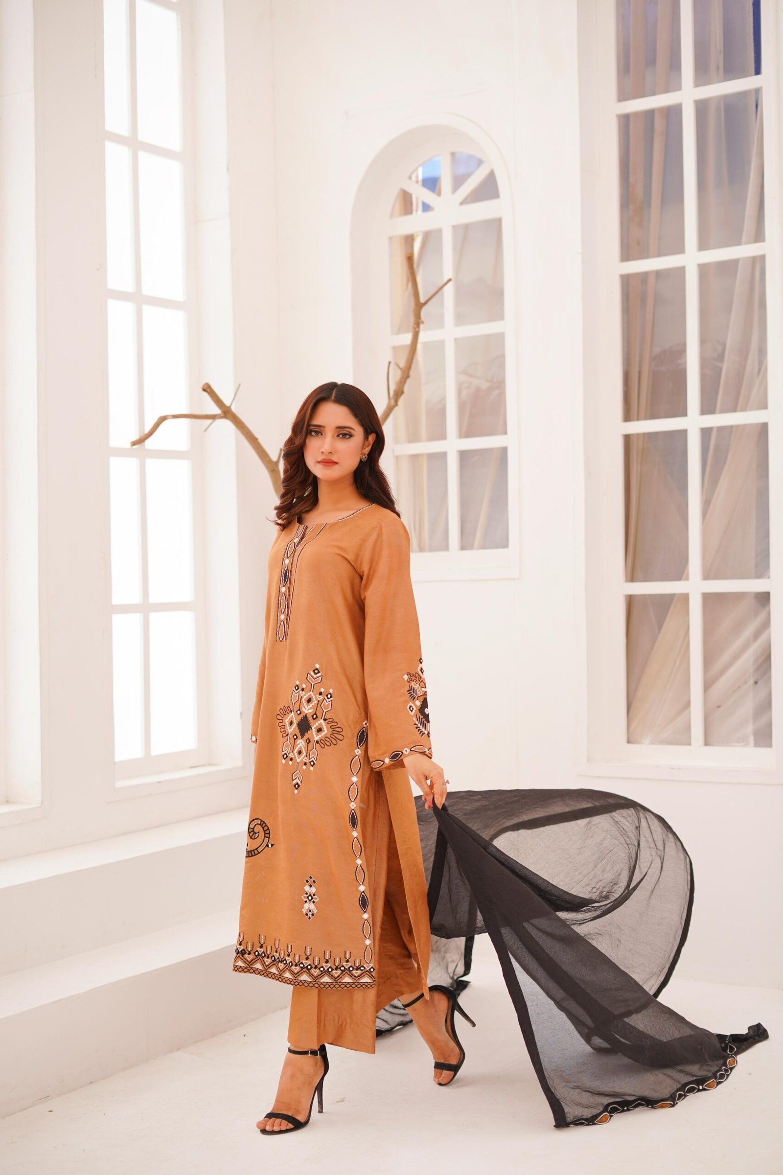This exquisite 3-piece is made of khadi cotton, crafted by machine embroidery and mirror work on the shirt and sleeves. The dupatta is in contrast to our evergreen colour palette and is made of khadi net with machine embroidery and mirrror work. Perfect blend for every occasion.