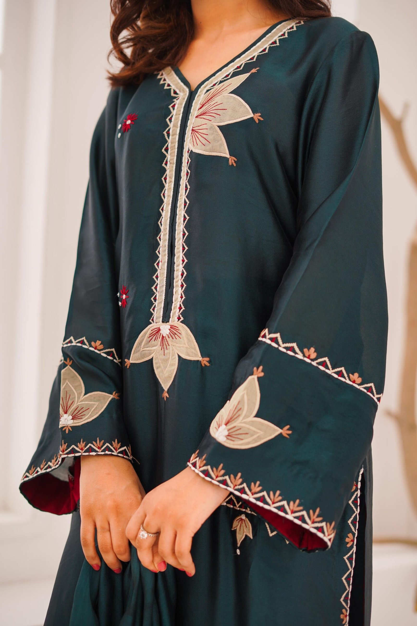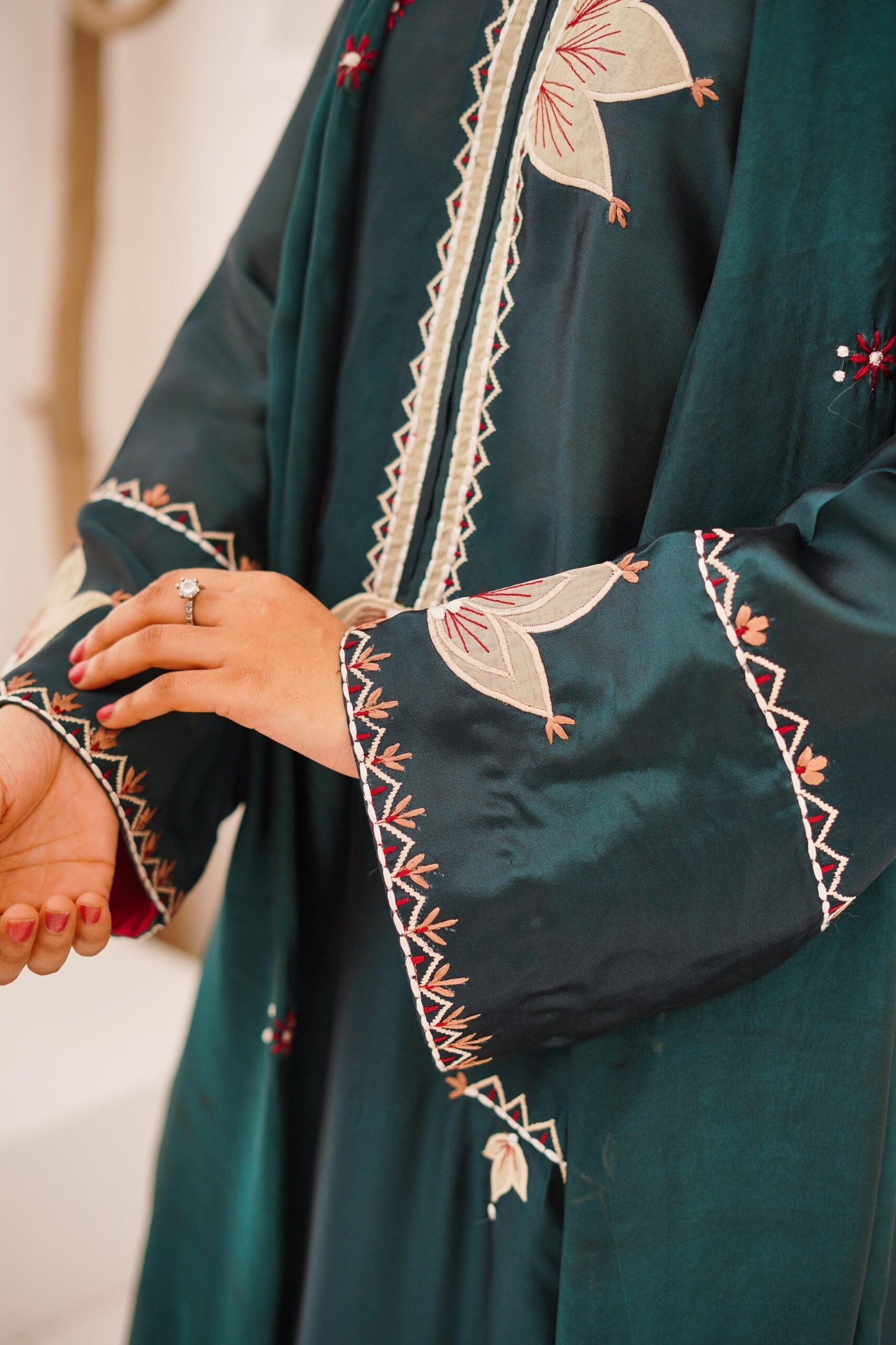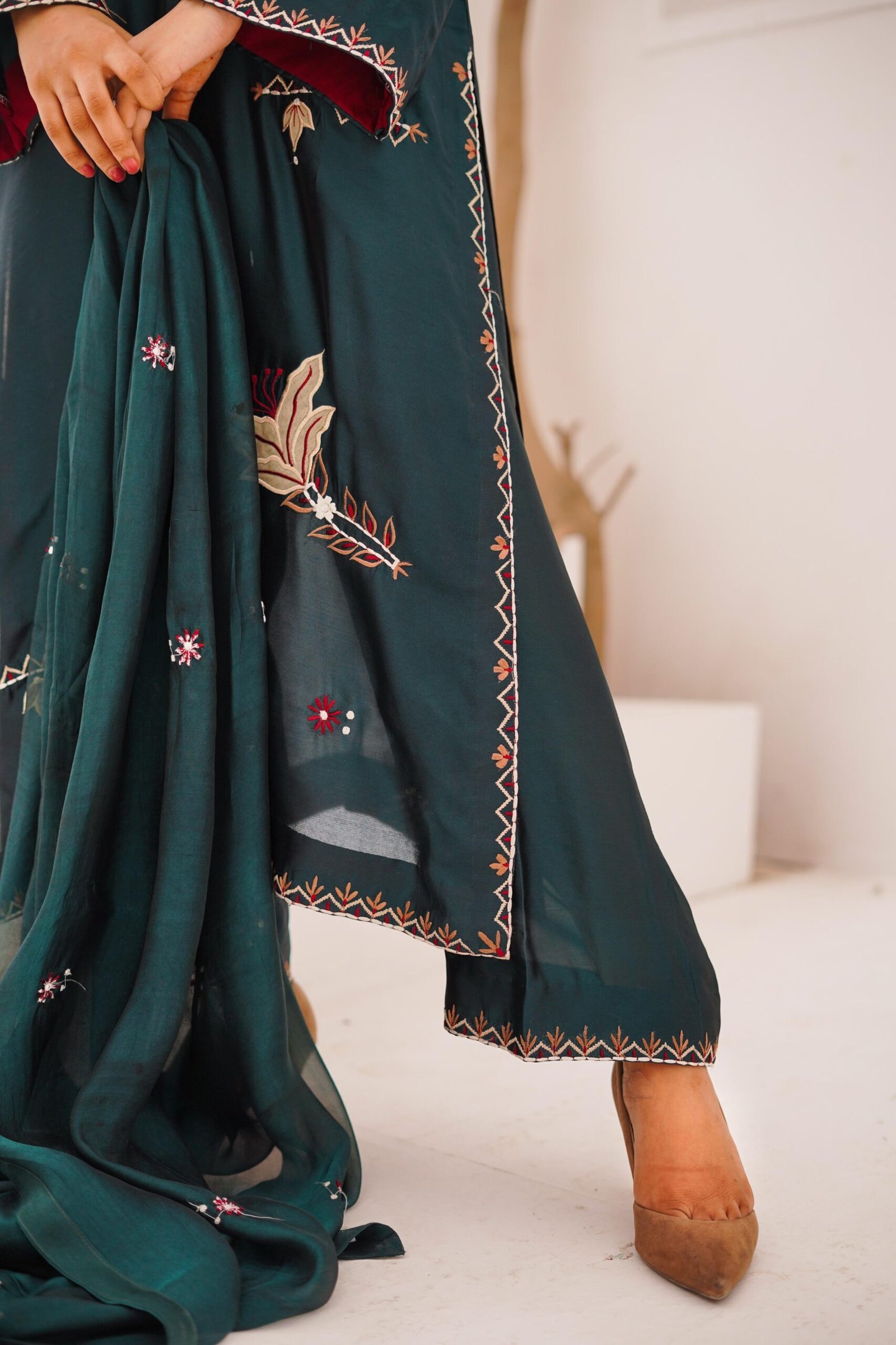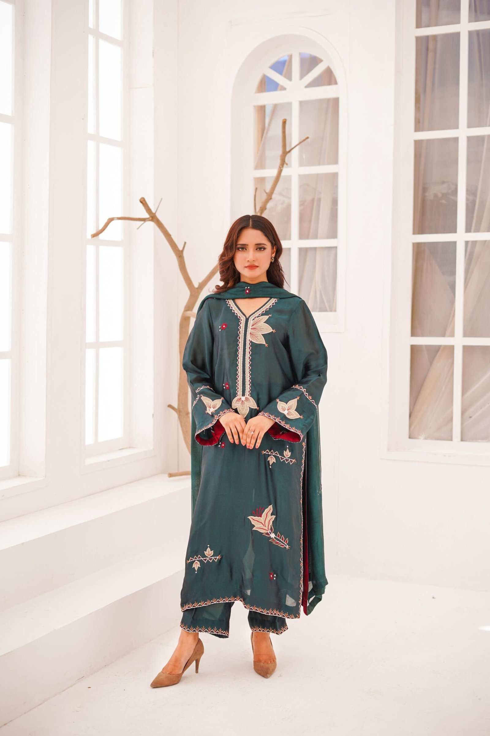 Fawn features exquisite intricate embroidery with a hint of antique gold on the shirt and back with motifs on the dupatta corners to finish the look with a contemporary panel flared pants. Crafted on premium pure sheesha silk with pure sheesha organza dupatta. Effortlessly the perfect ensemble for every occasion.