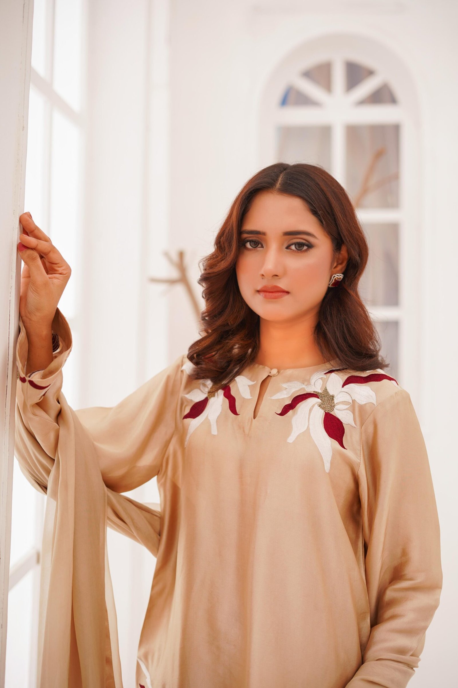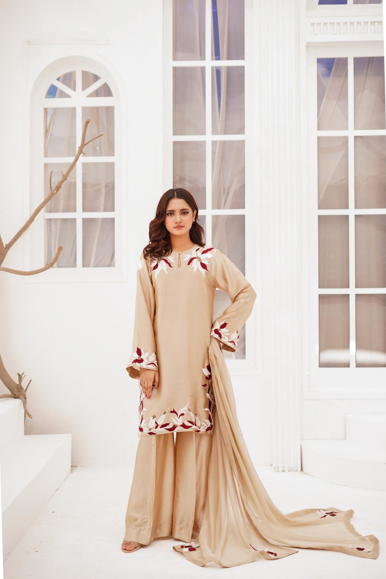 Fawn features exquisite intricate embroidery with a hint of antique gold on the shirt and back with motifs on the dupatta corners to finish the look with a contemporary panel flared pants. Crafted on premium pure sheesha silk with pure sheesha organza dupatta. Effortlessly the perfect ensemble for every occasion.