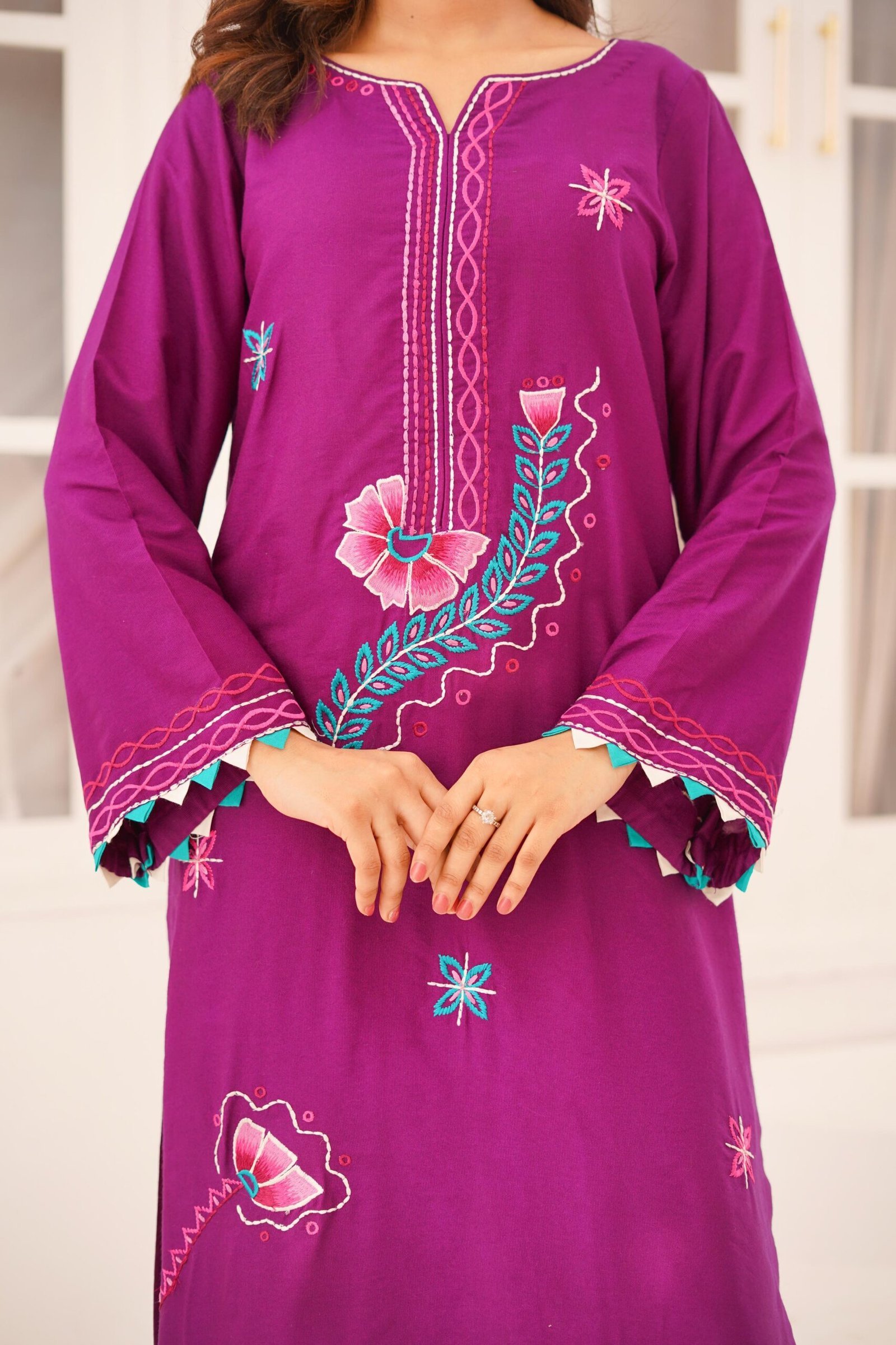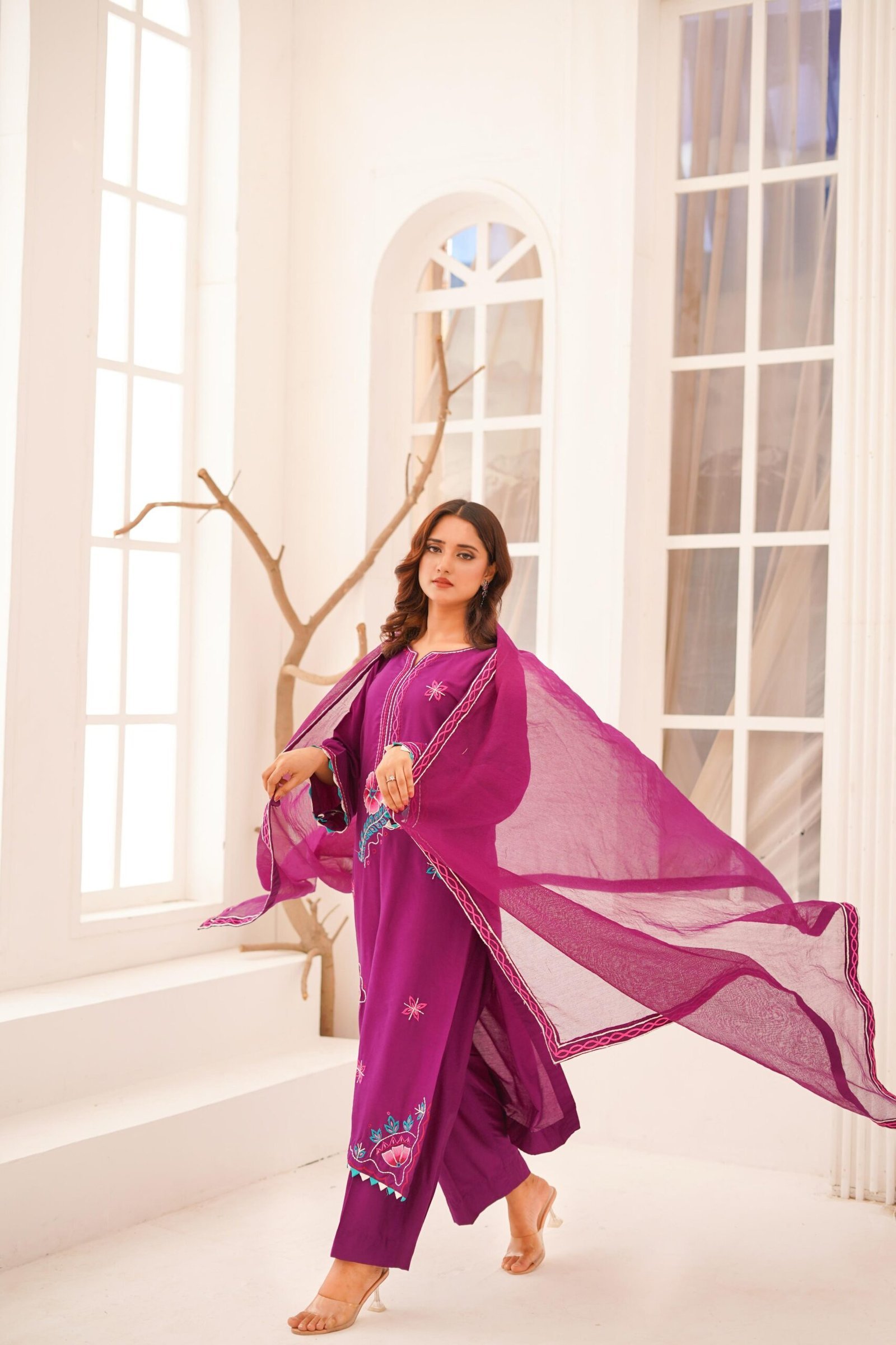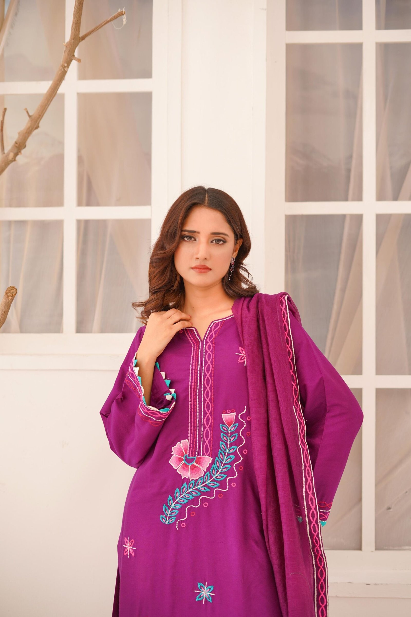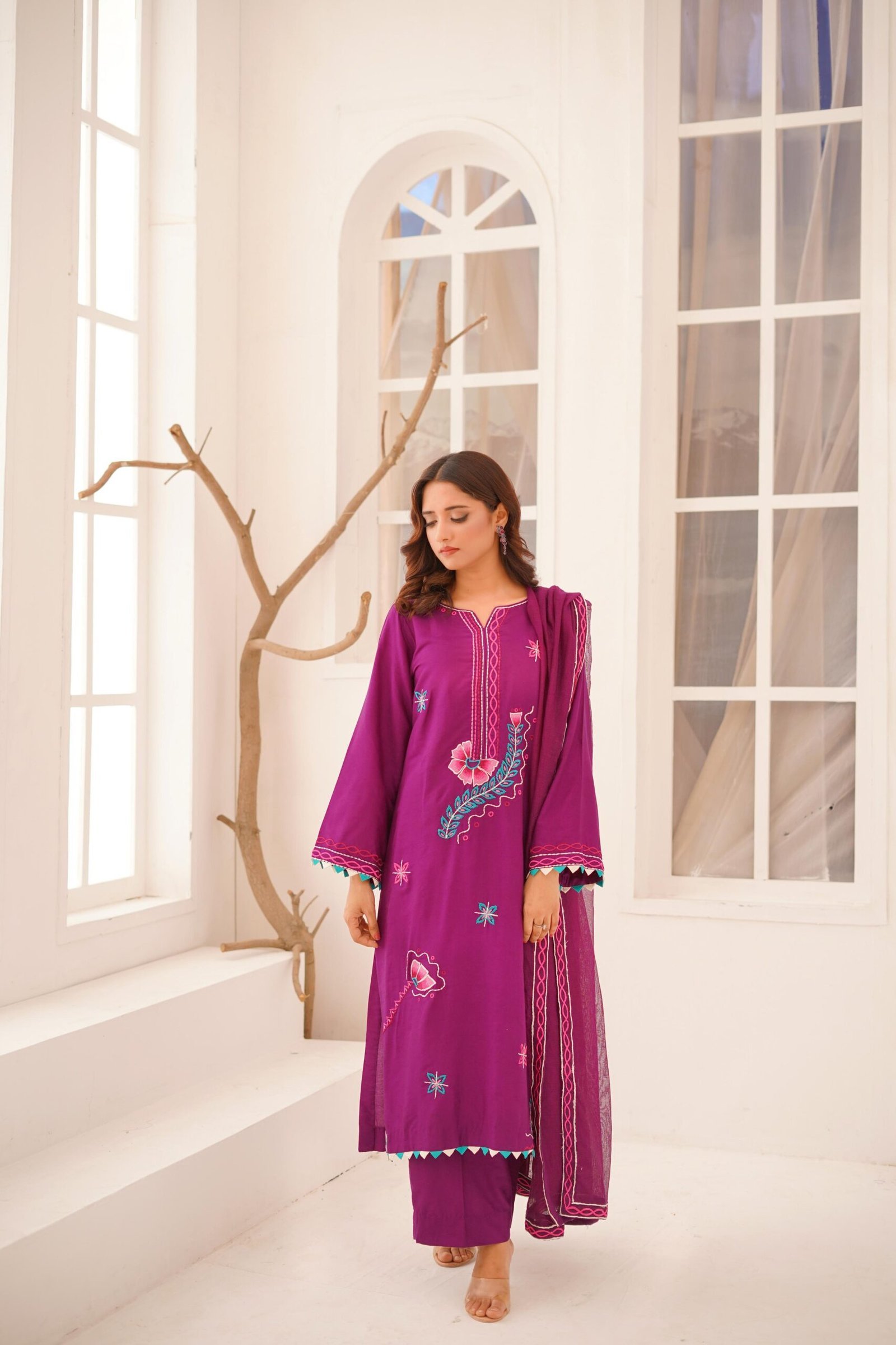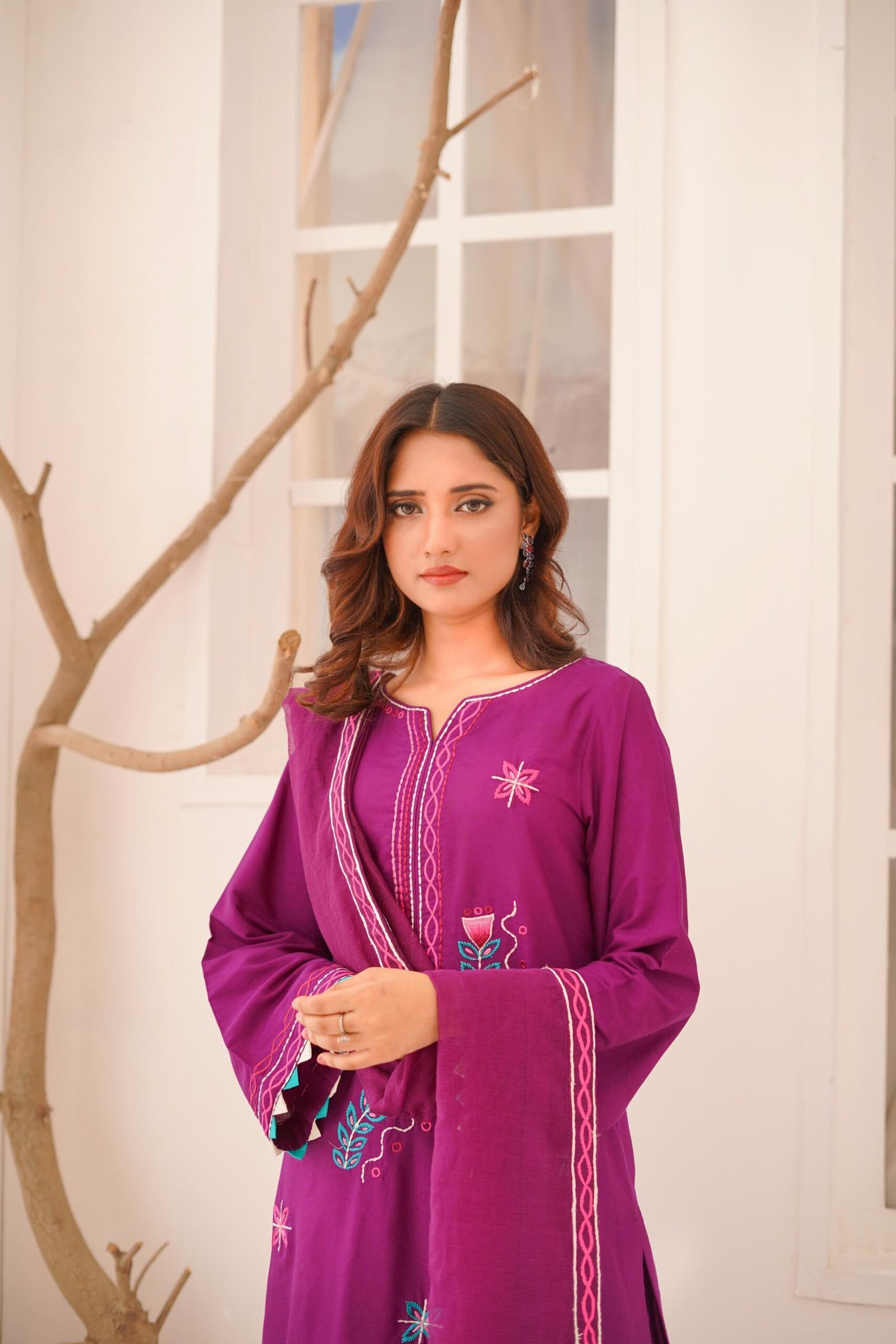 This exquisite 3-piece is made of khadi cotton, crafted by machine embroidery on the shirt and sleeves. The dupatta is made of khadi net with machine embroided borders. Perfect blend for a festive occasion.