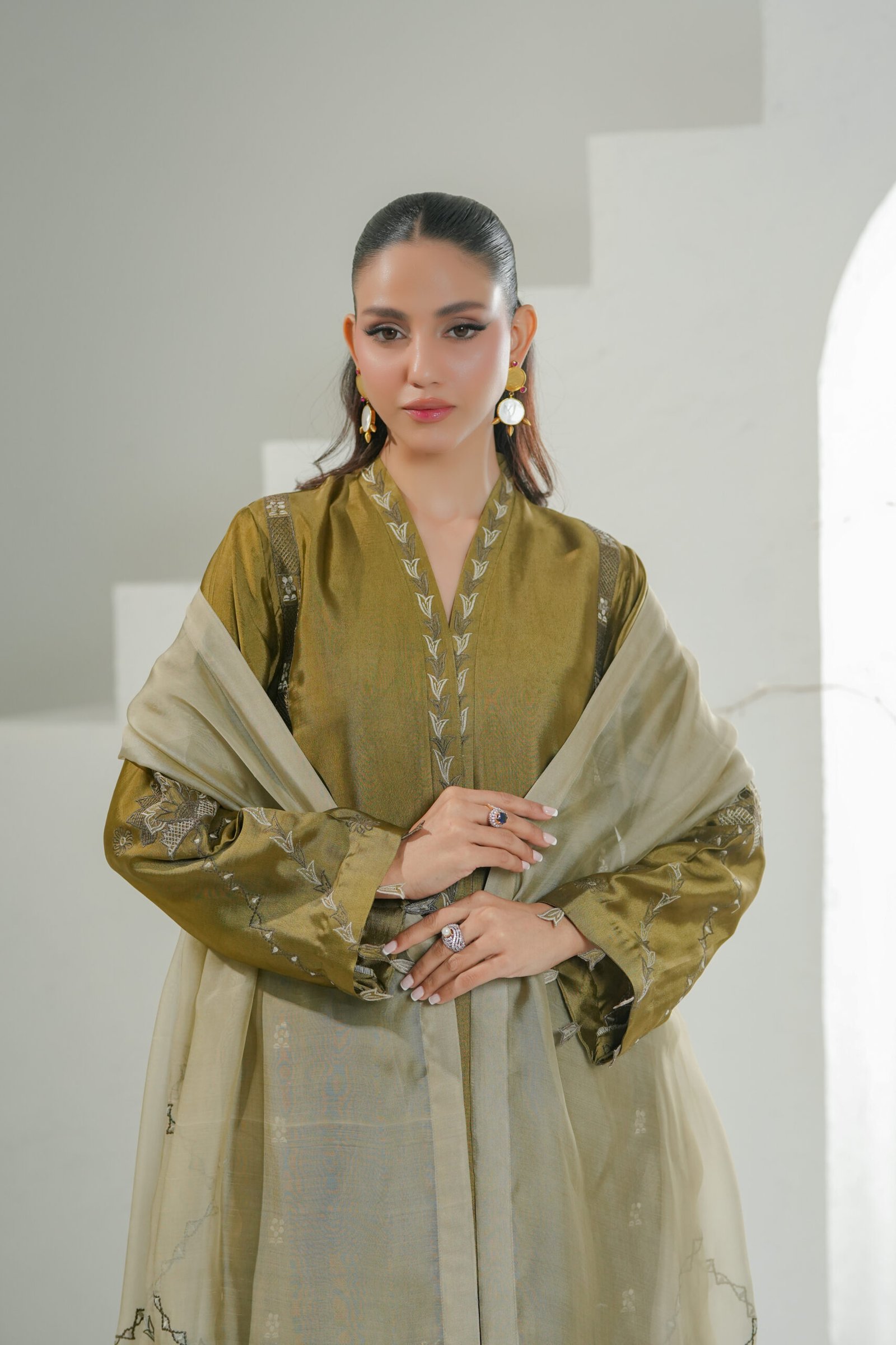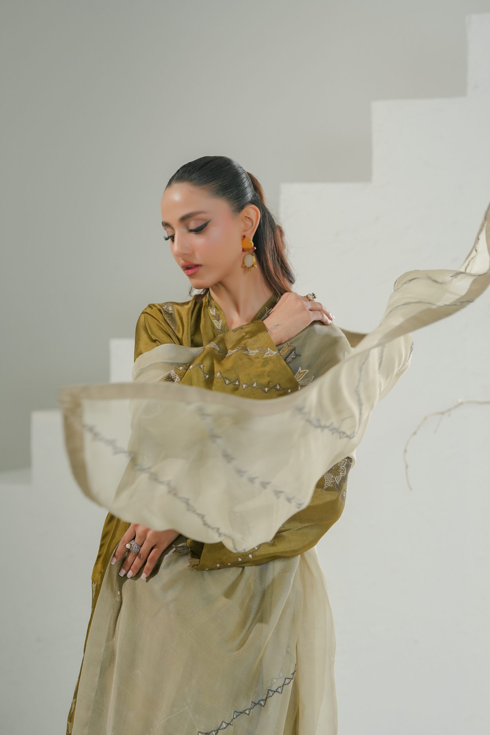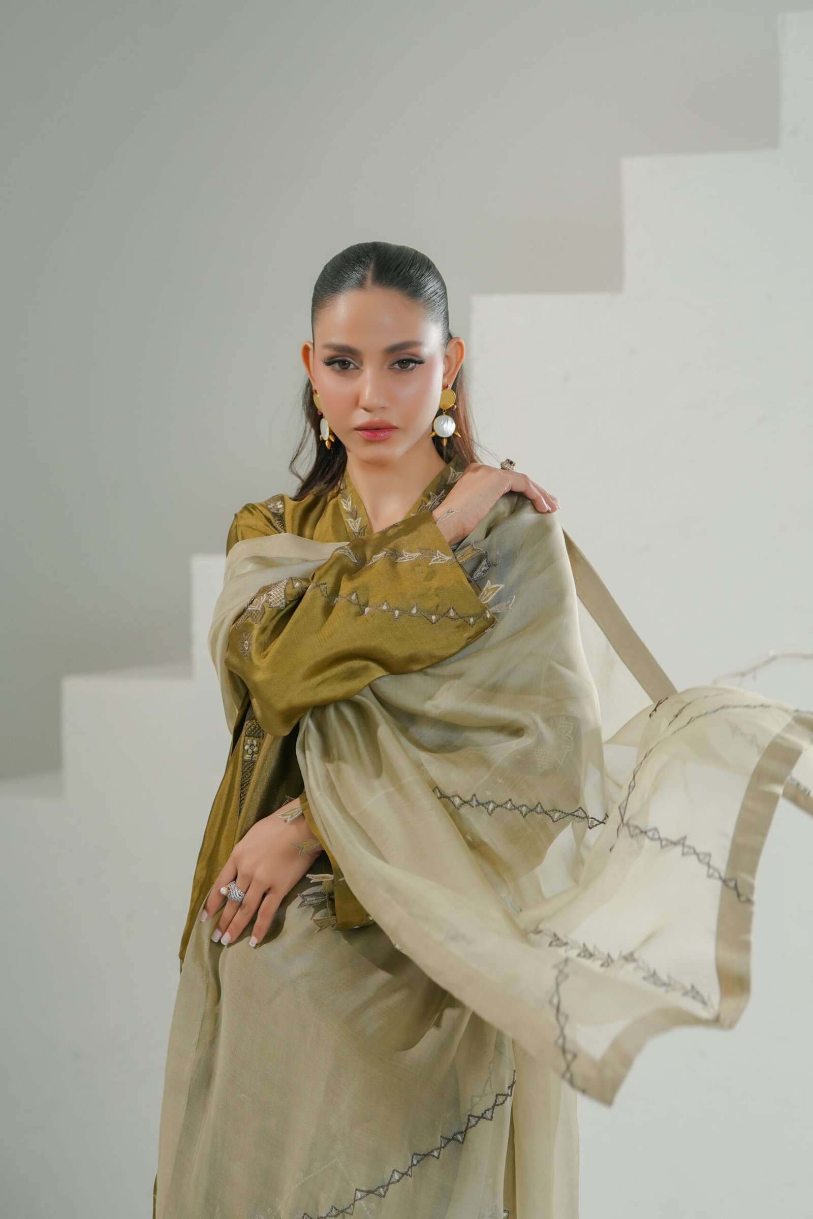 Rendered in a unique greenish-brown golden hue, this ensemble showcases detailed cross-stitch embroidery on the shirt, echoed on the contrasting dupatta. Paired with tailored pants, the look is distinctive, earthy, and richly textured.