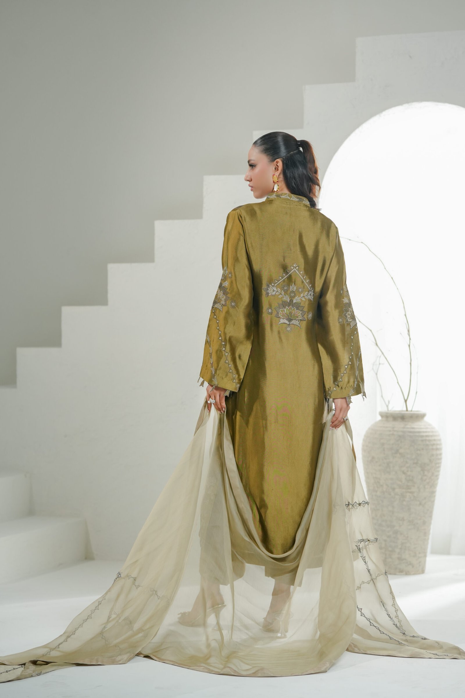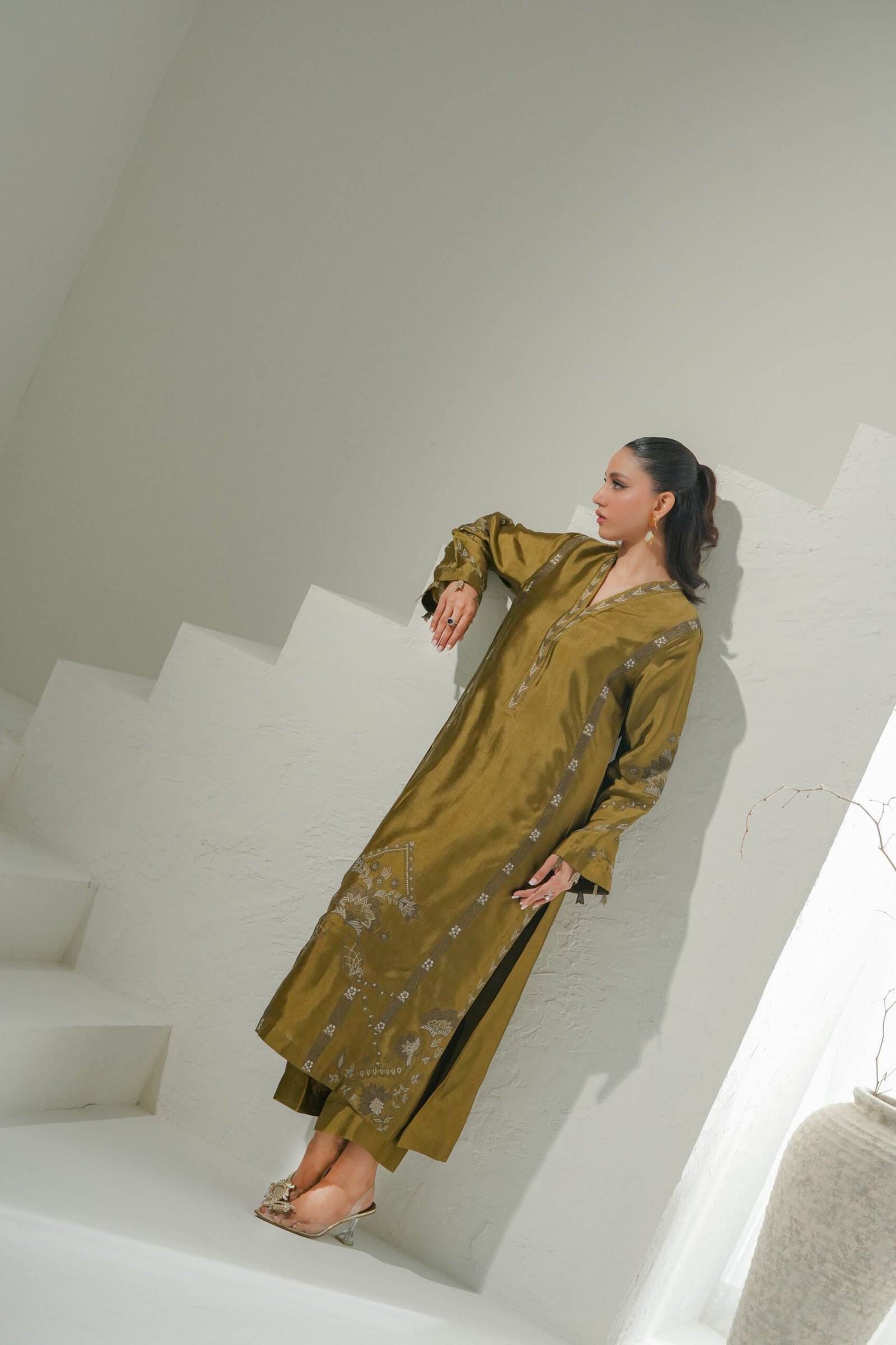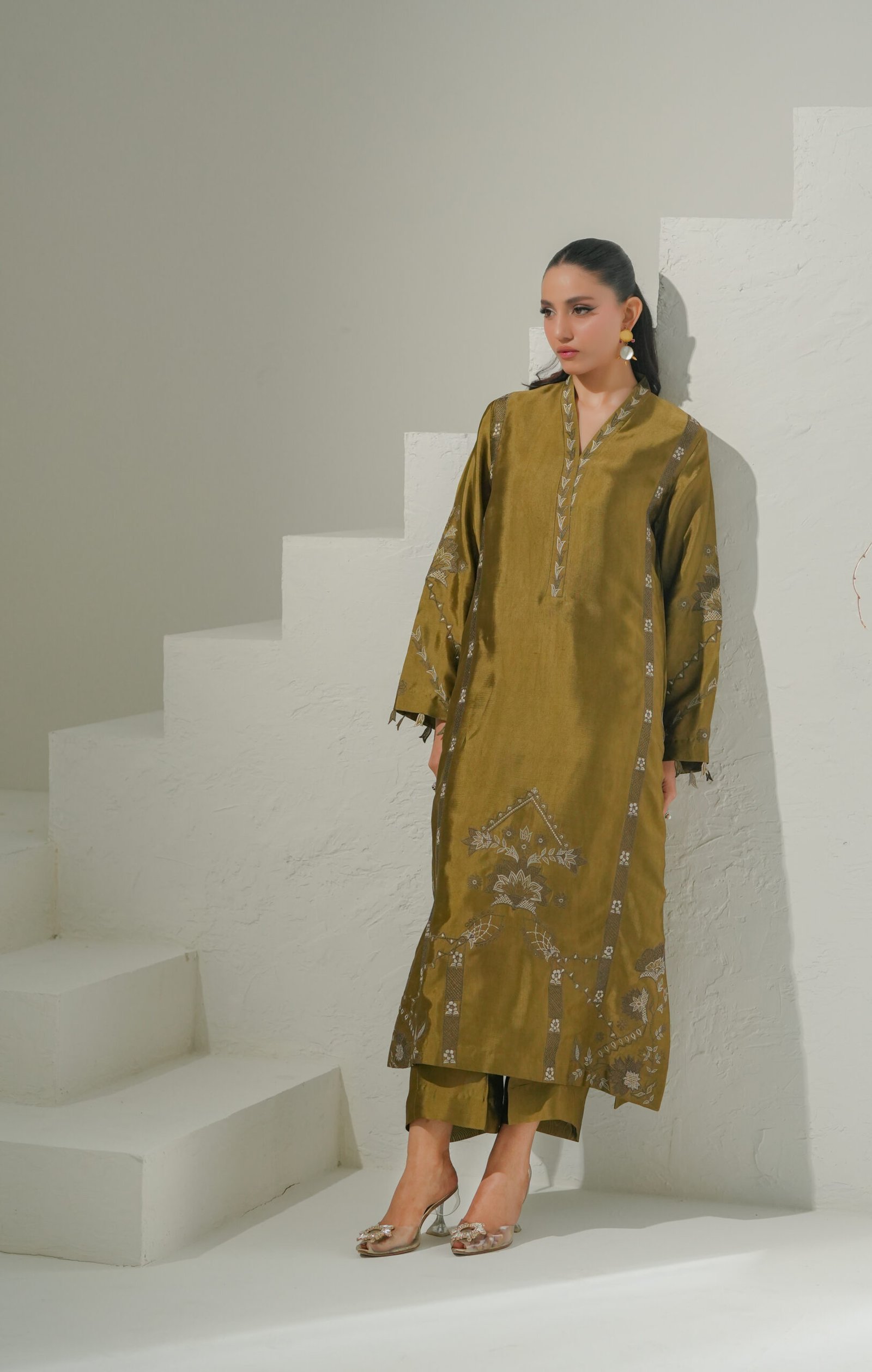 Rendered in a unique greenish-brown golden hue, this ensemble showcases detailed cross-stitch embroidery on the shirt, echoed on the contrasting dupatta. Paired with tailored pants, the look is distinctive, earthy, and richly textured.