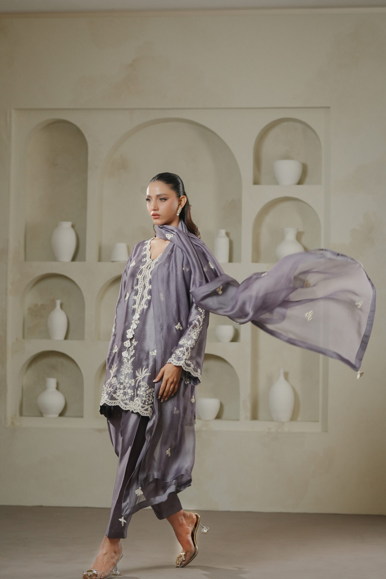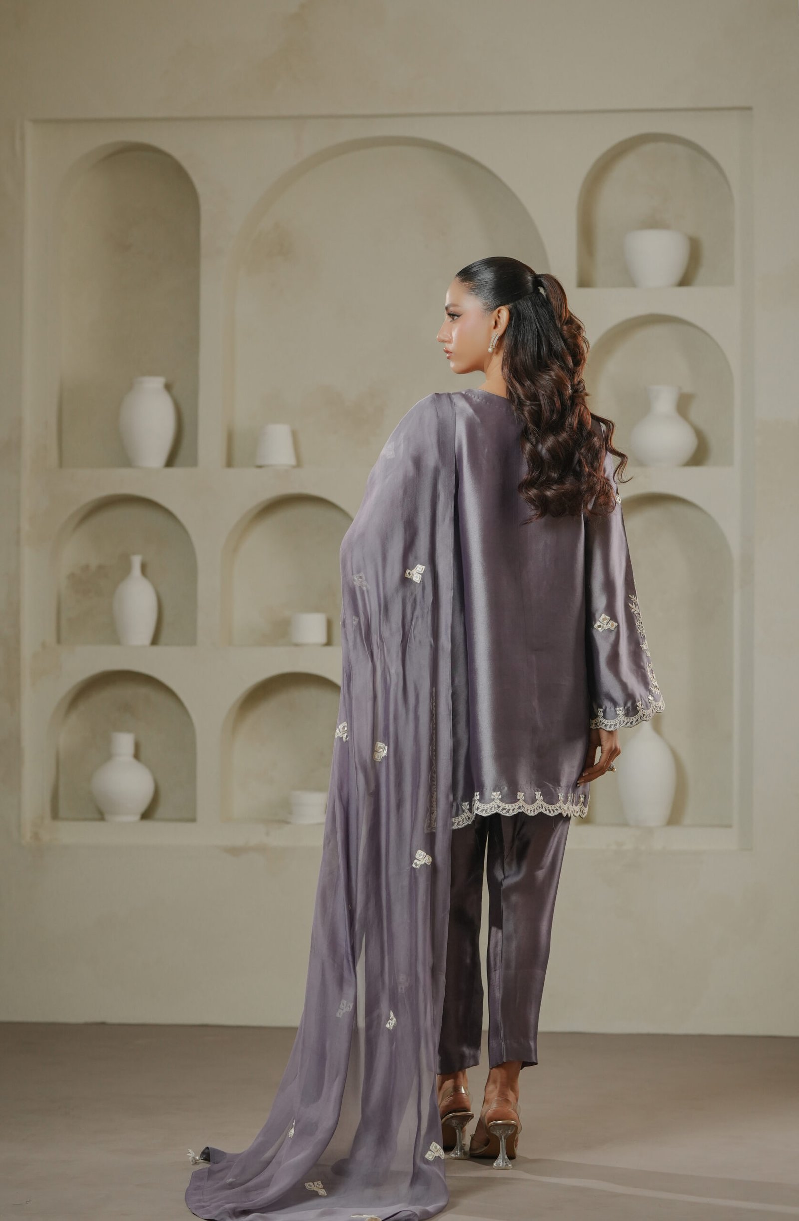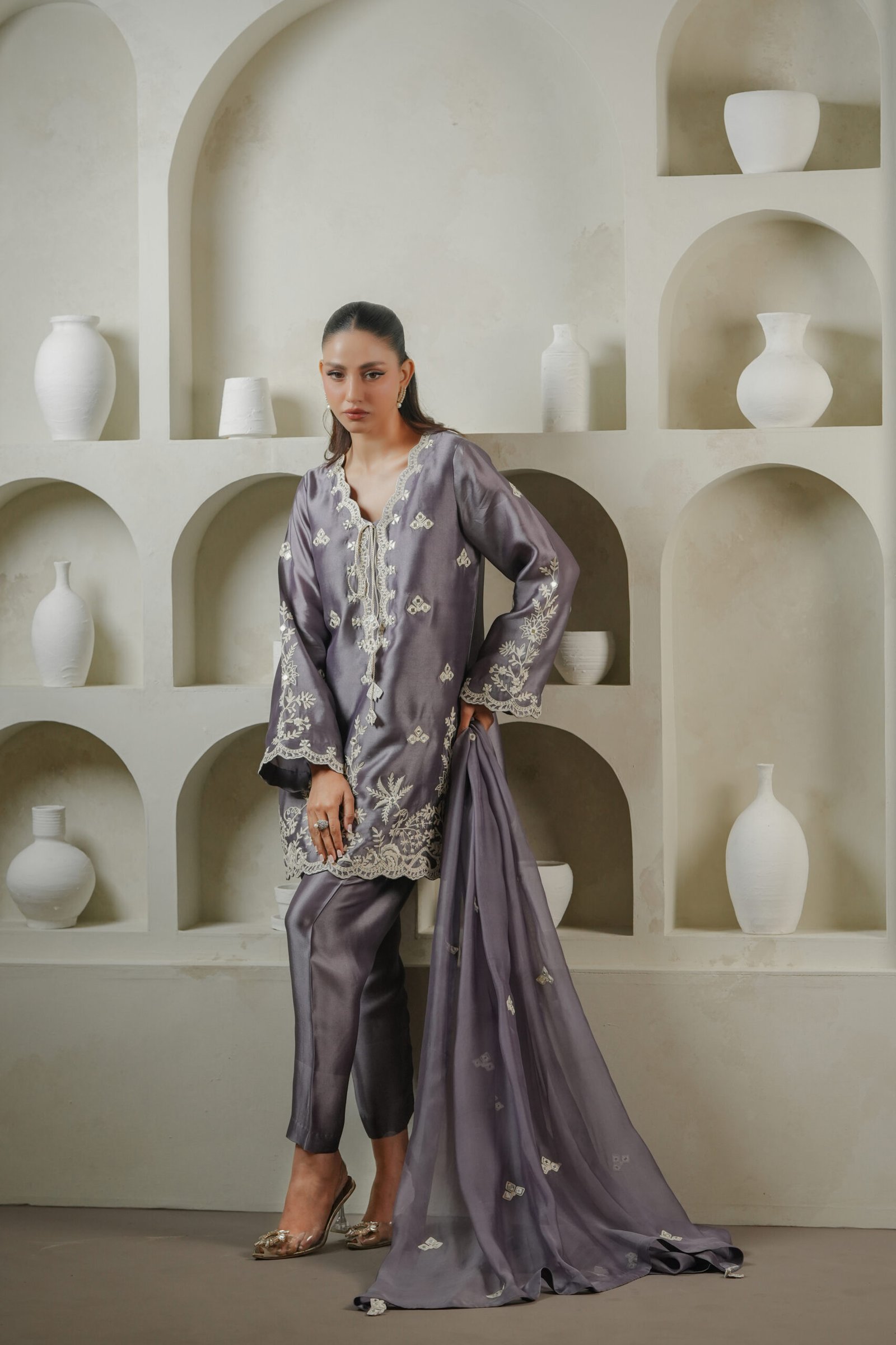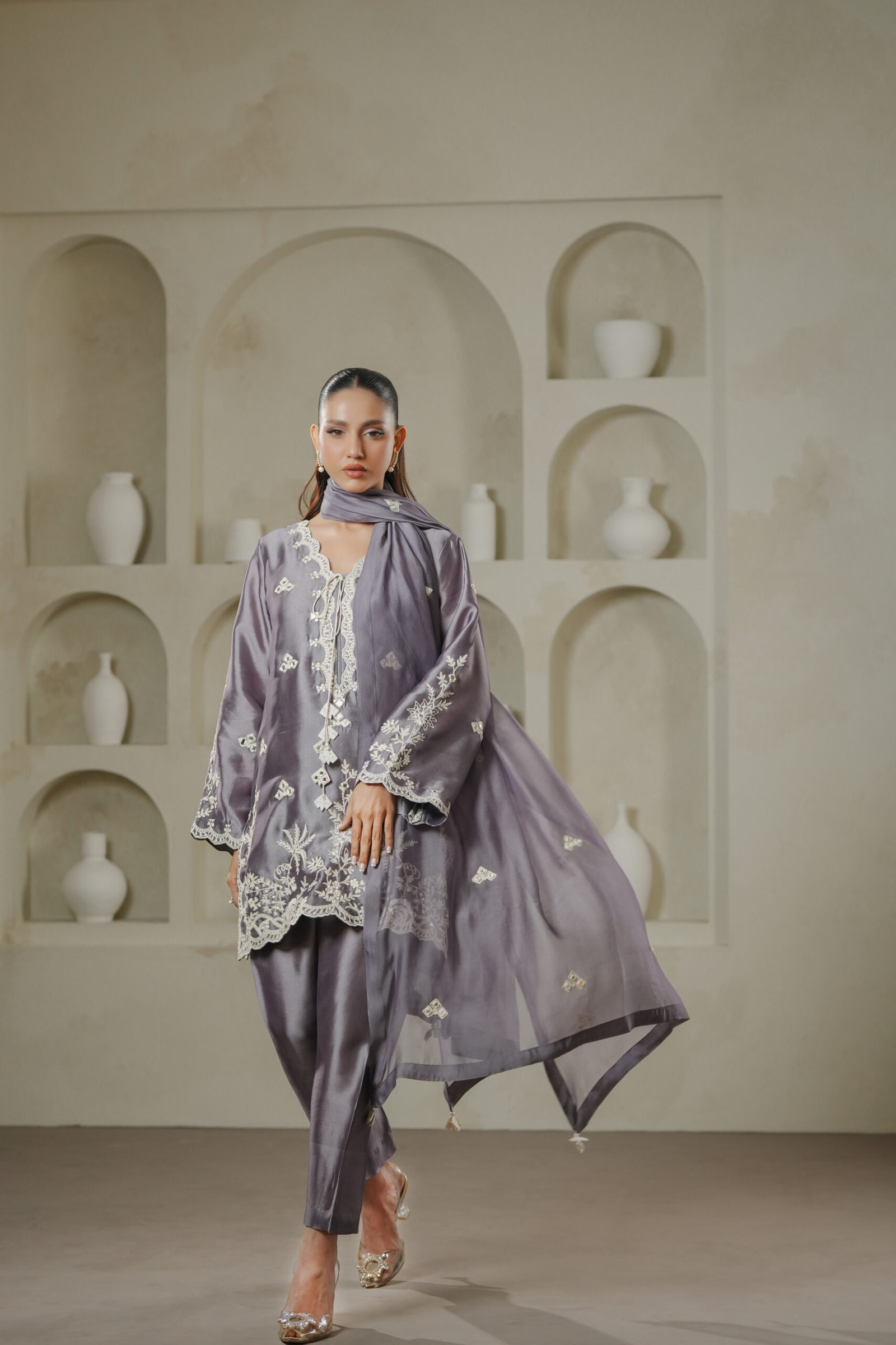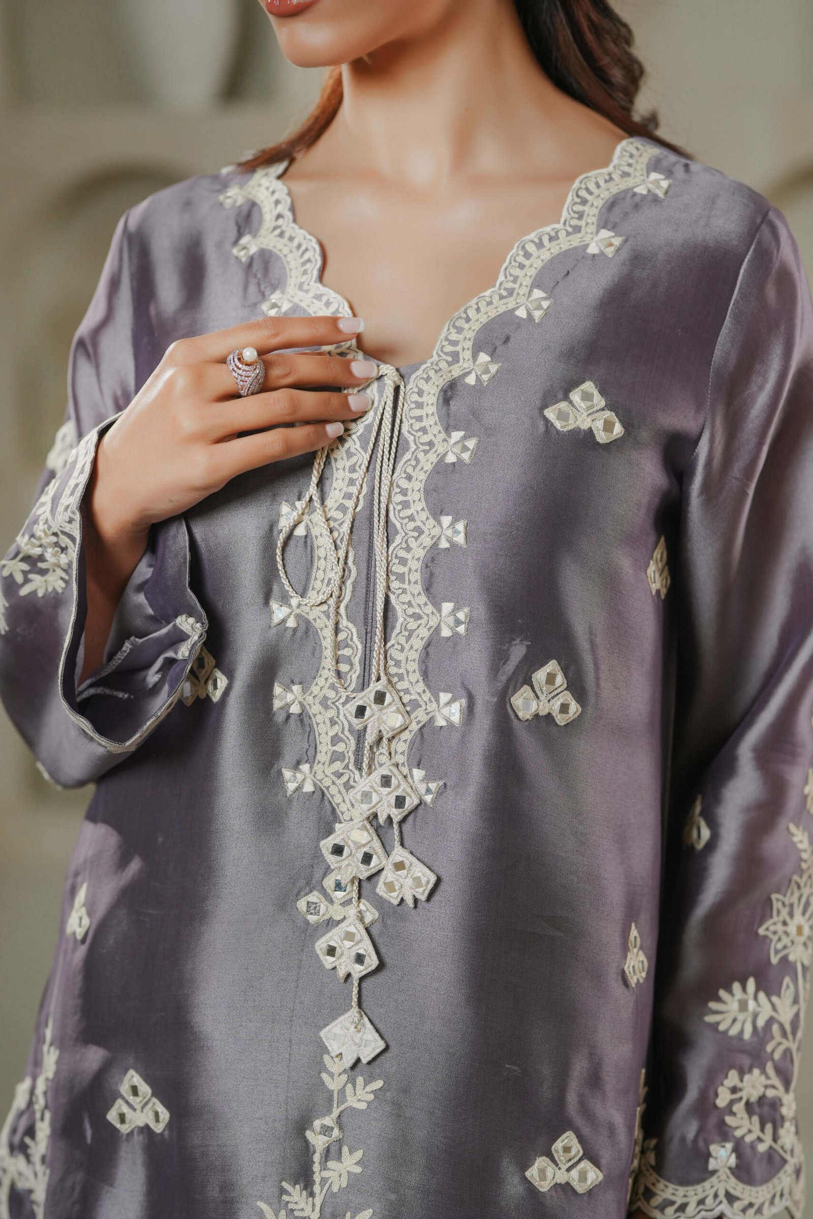 A sophisticated purplish grey ensemble adorned with a blend of ari embroidery and intricate mirror work across the shirt and dupatta. Tassel detailing on the shirt adds character and movement, while the shalwar completes the look with traditional elegance.