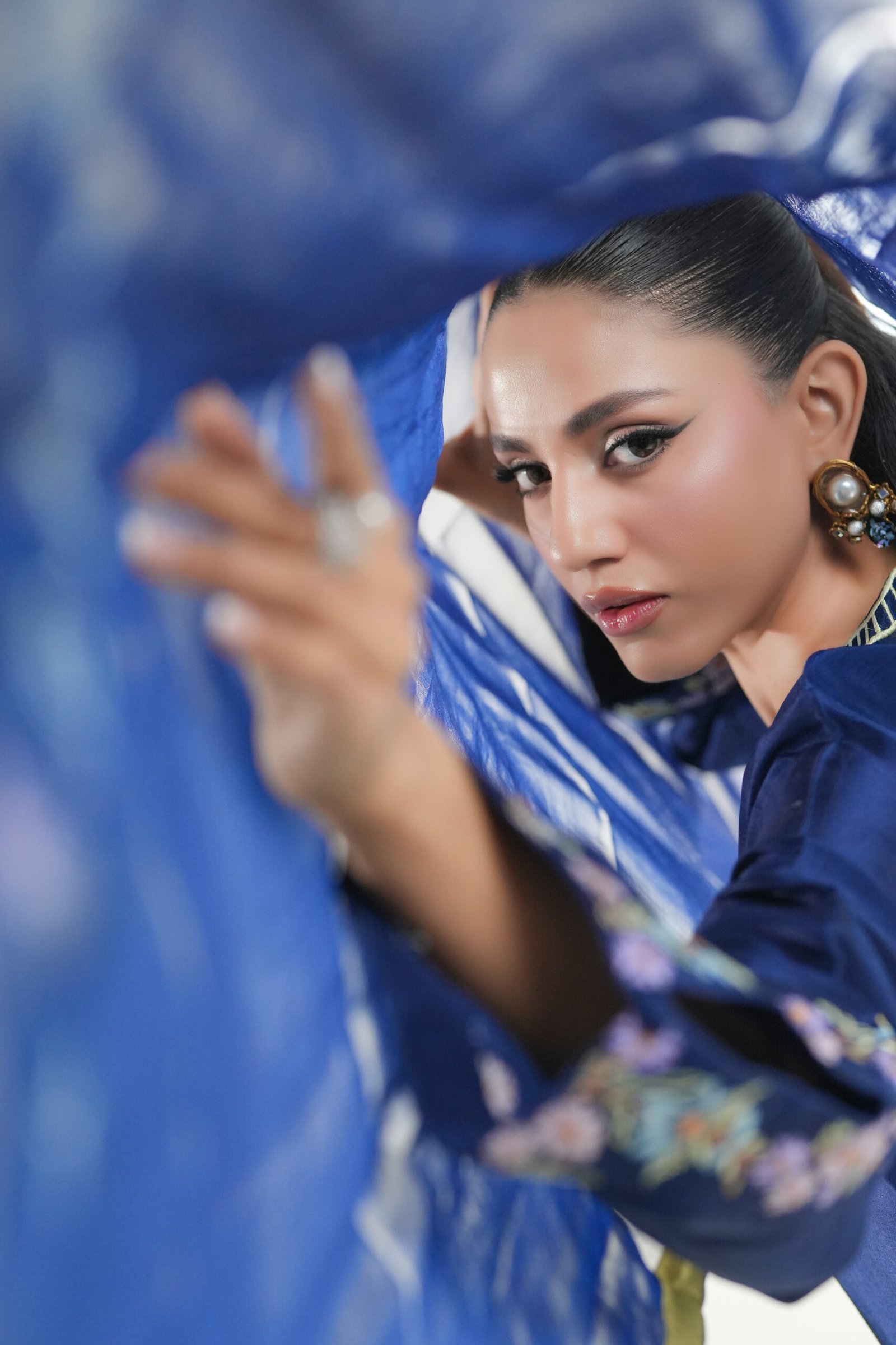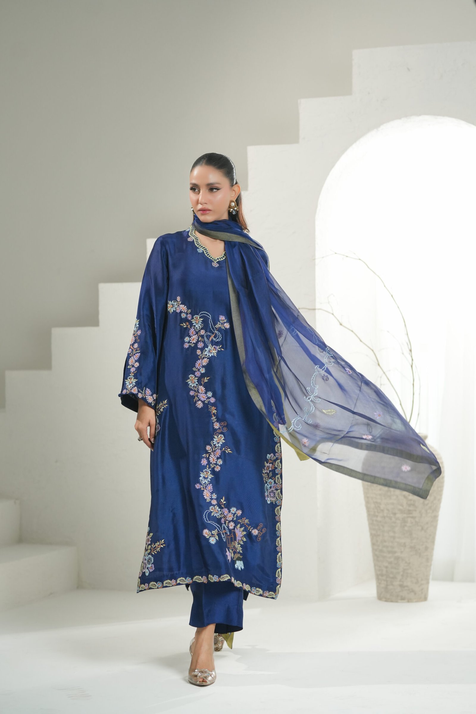 An elegant navy blue ensemble featuring intricate contrasting embroidery that highlights the structure of the shirt and flows seamlessly onto the dupatta. Paired with relaxed loose pants, this piece reflects the essence of MÍRA — precise, graceful, and effortlessly chic.
