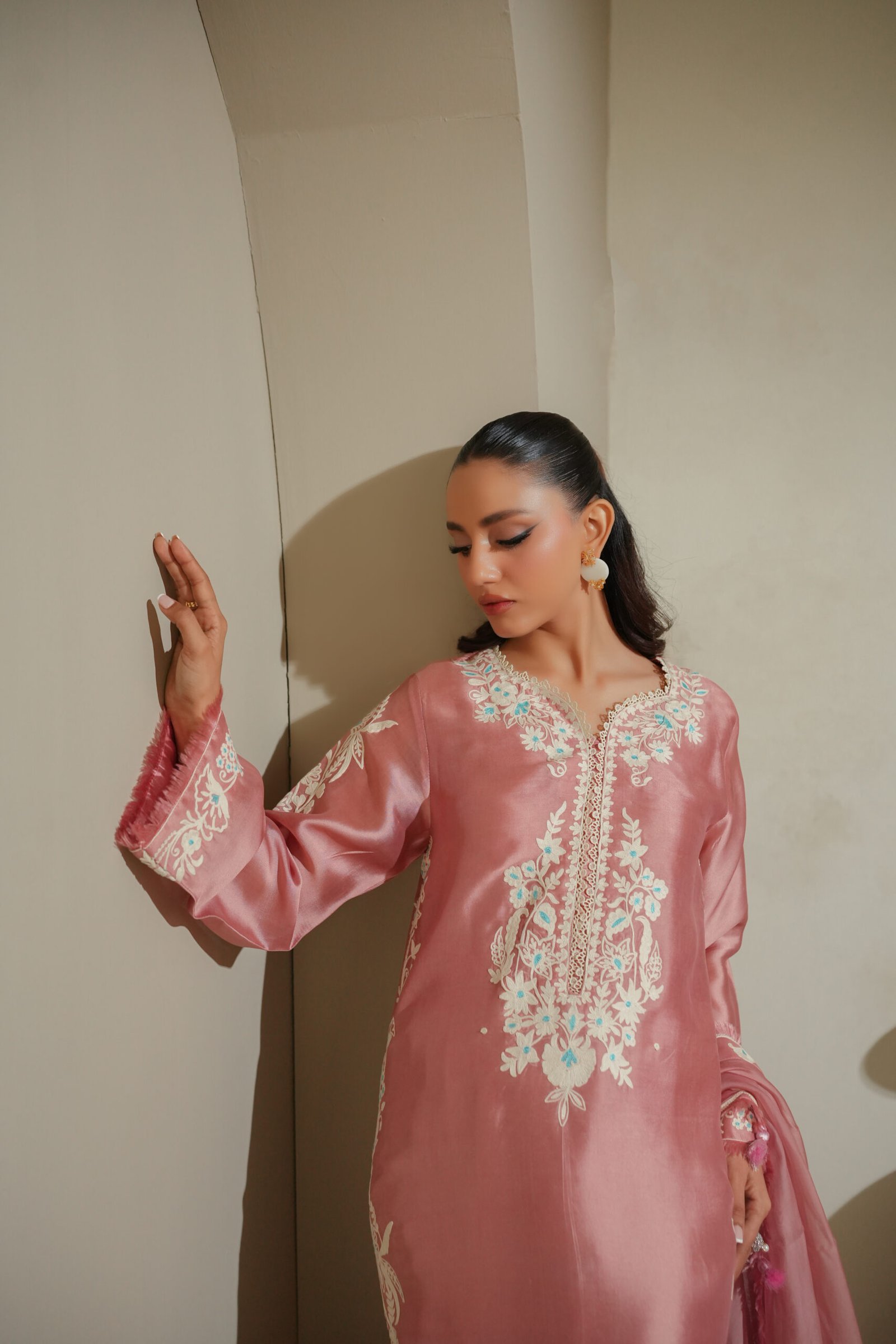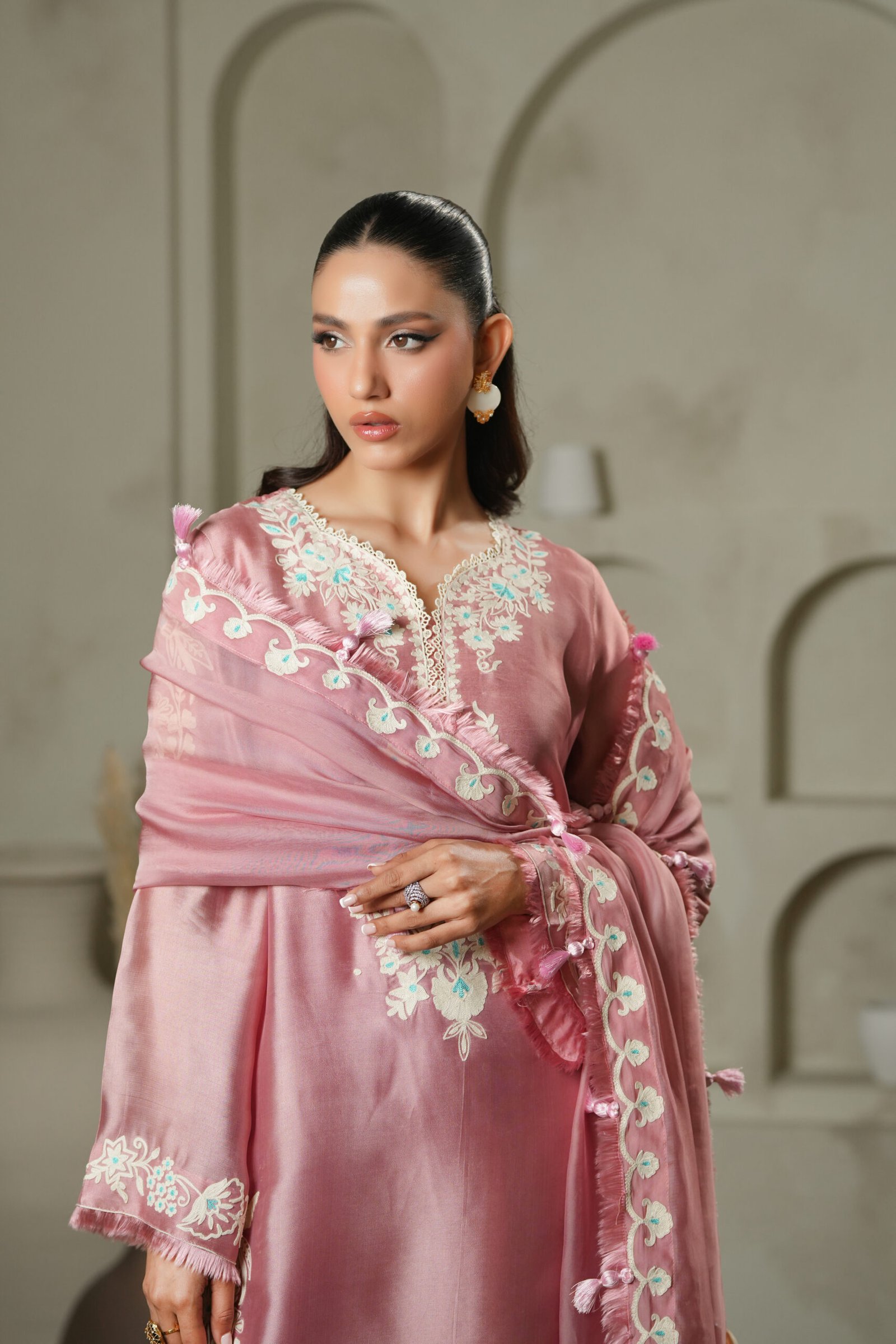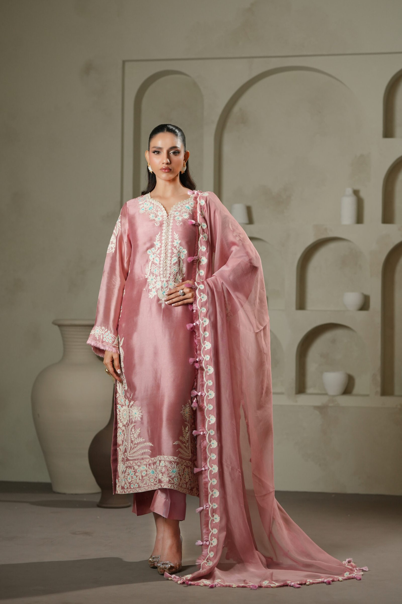 Rendered in a unique greenish-brown golden hue, this ensemble showcases detailed cross-stitch embroidery on the shirt, echoed on the contrasting dupatta. Paired with tailored pants, the look is distinctive, earthy, and richly textured.