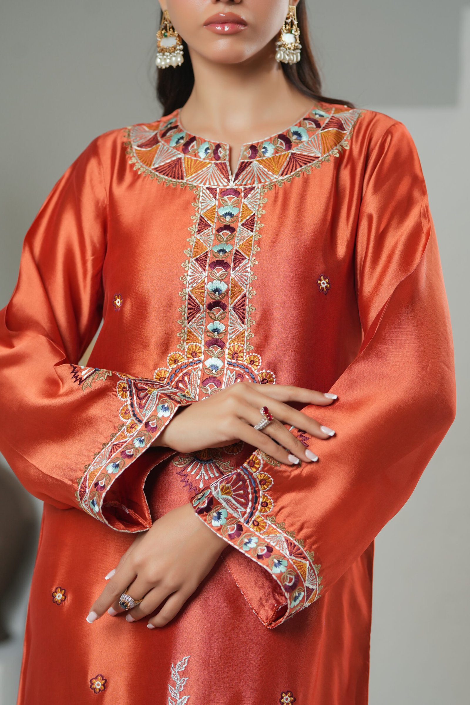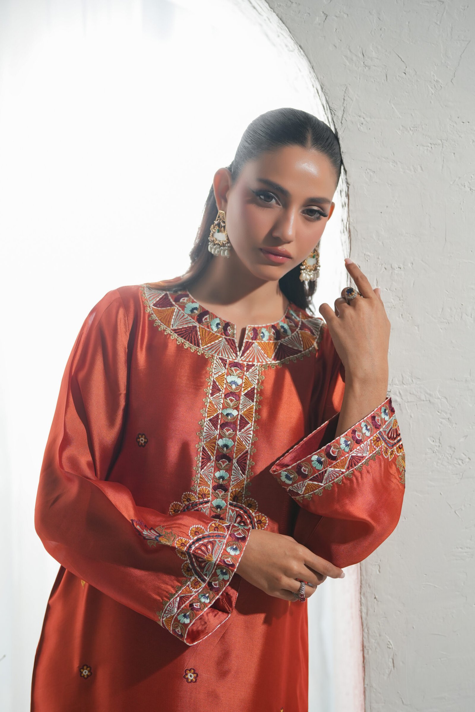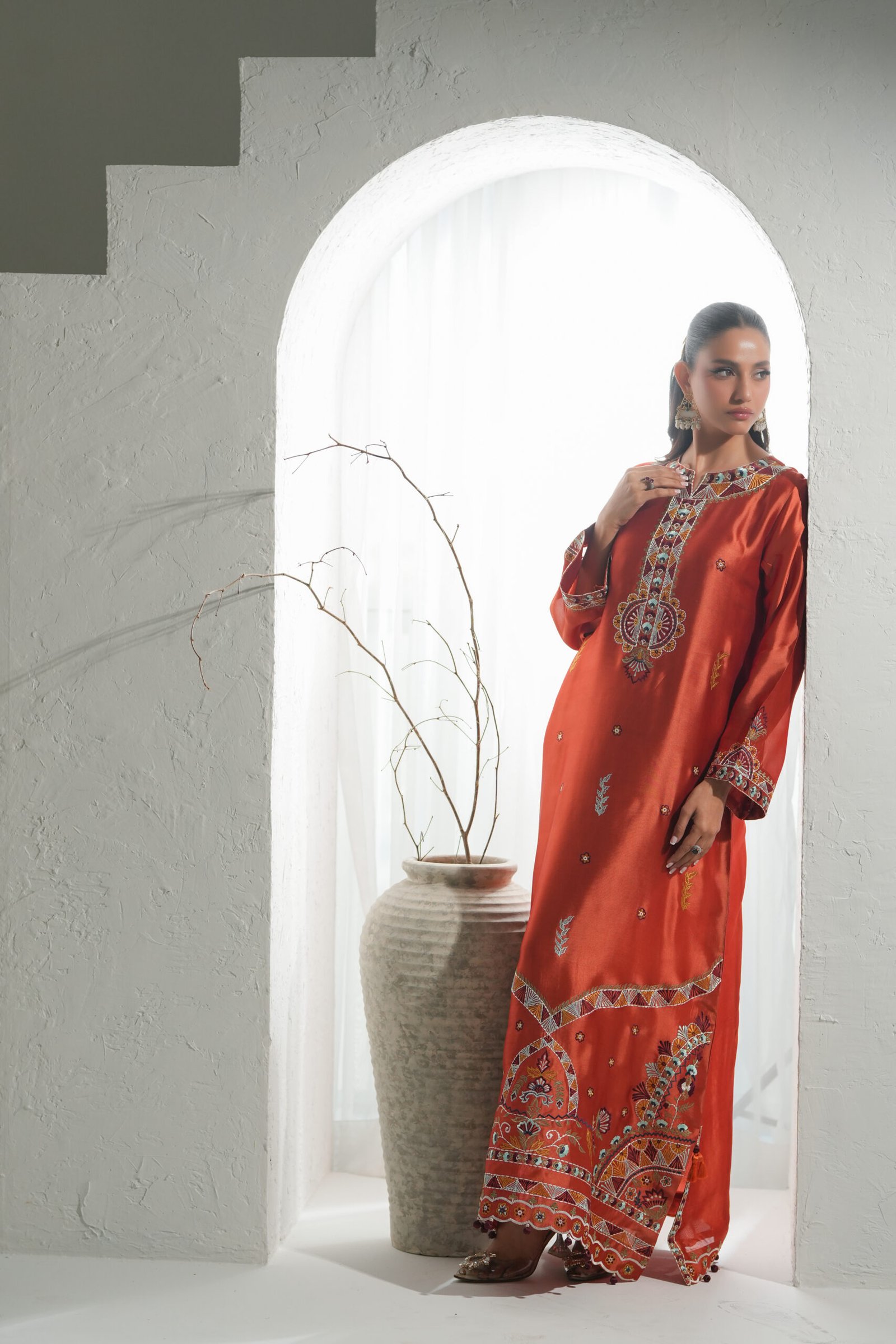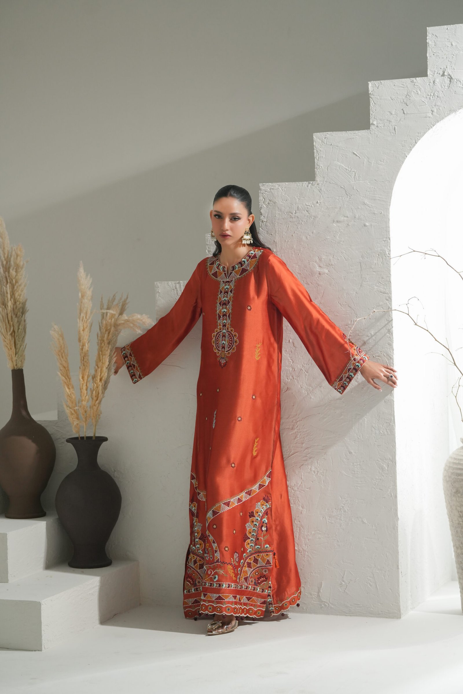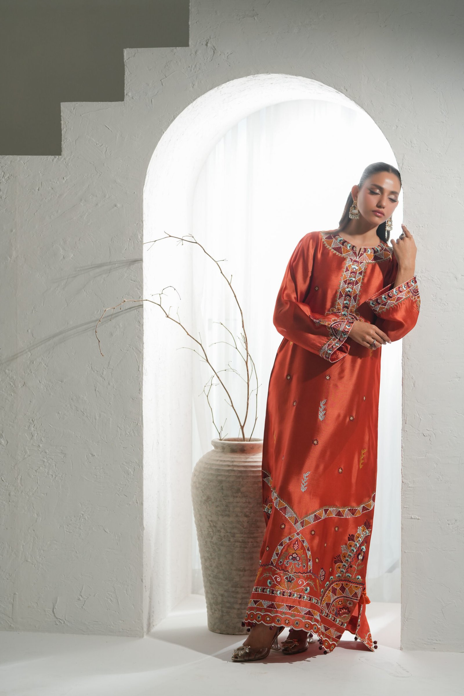 A bold expression of craftsmanship, this rust orange kaftan features a rich mix of embroidery stitches in striking contrasting hues. Finished with tassel detailing and paired with pants, this statement piece is designed to stand out while remaining rooted in refined elegance.