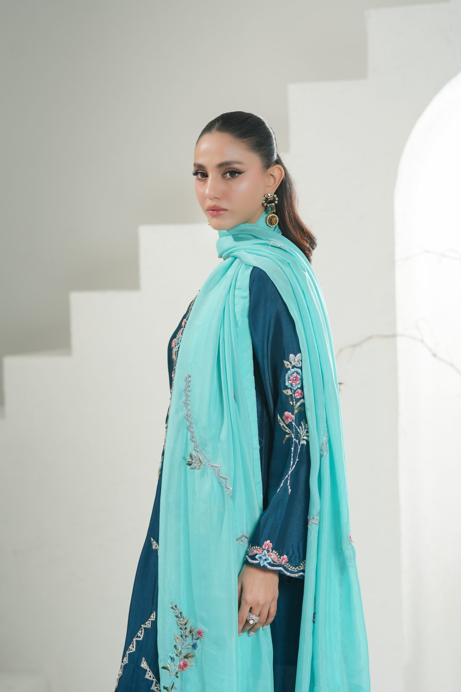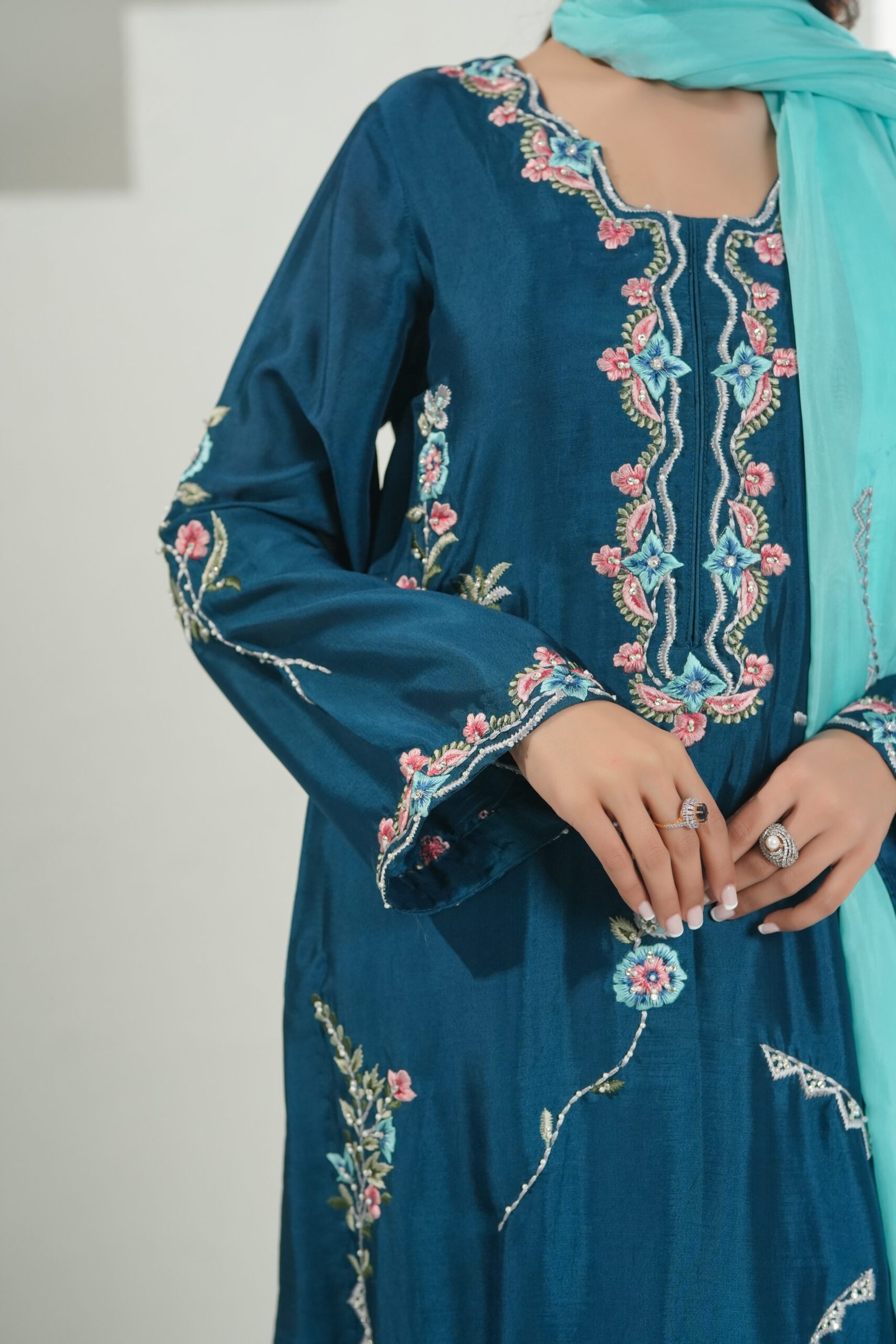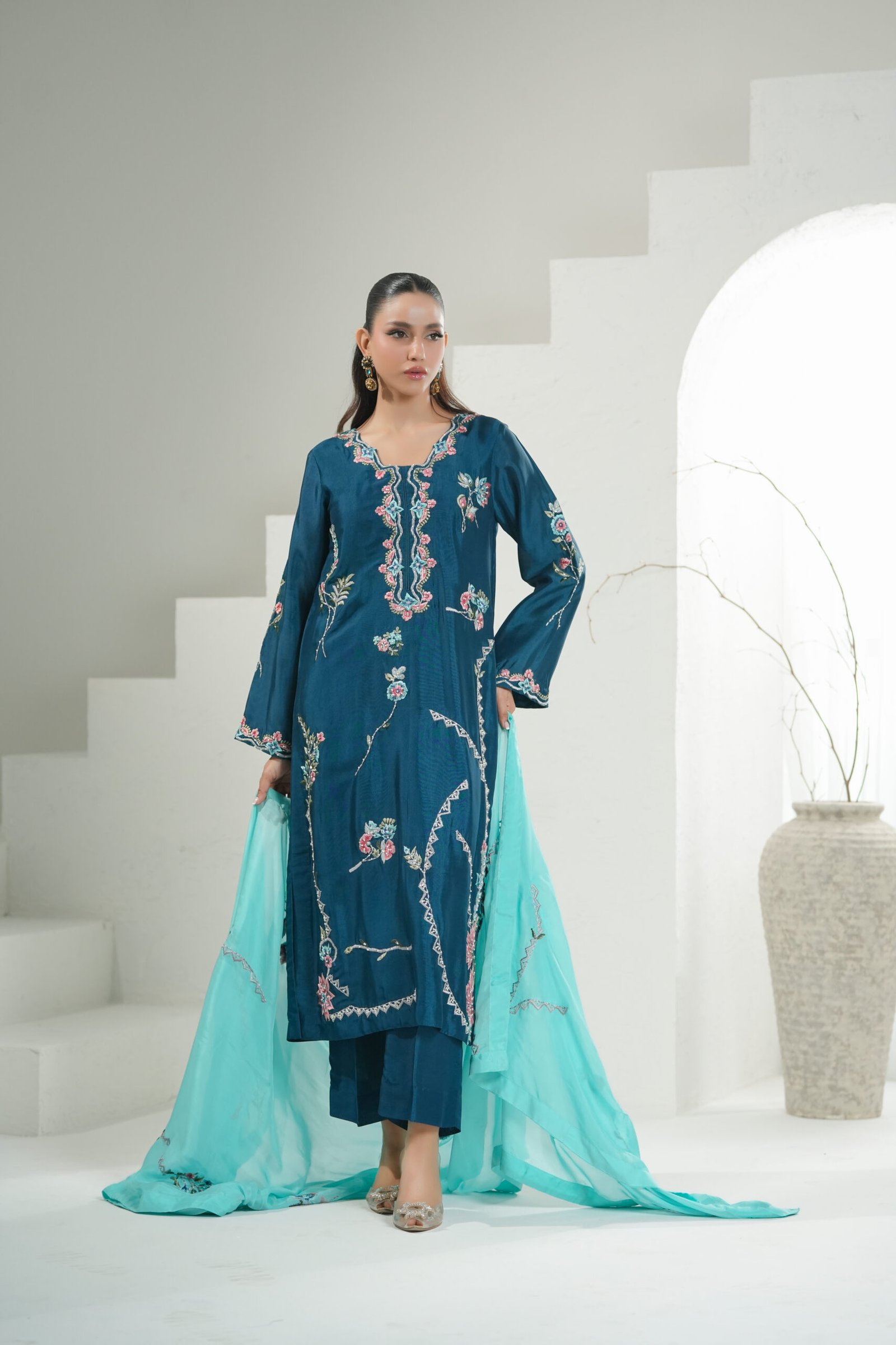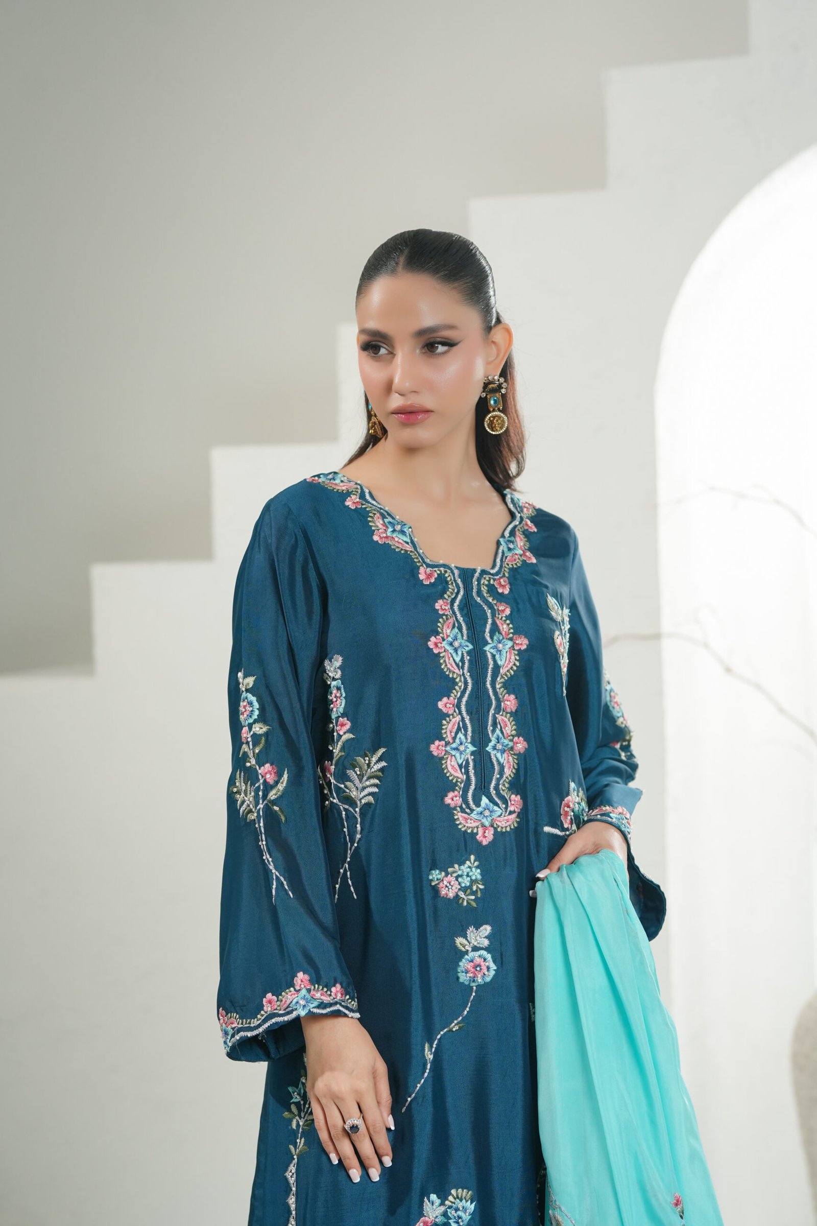 A refined teal ensemble elevated with contrasting embroidery and delicate hand-touch detailing. The shirt is paired with a ferozi blue dupatta, adorned with intricate embroidery that adds movement and charm. Finished with relaxed loose pants, this piece embodies effortless elegance with thoughtful craftsmanship.