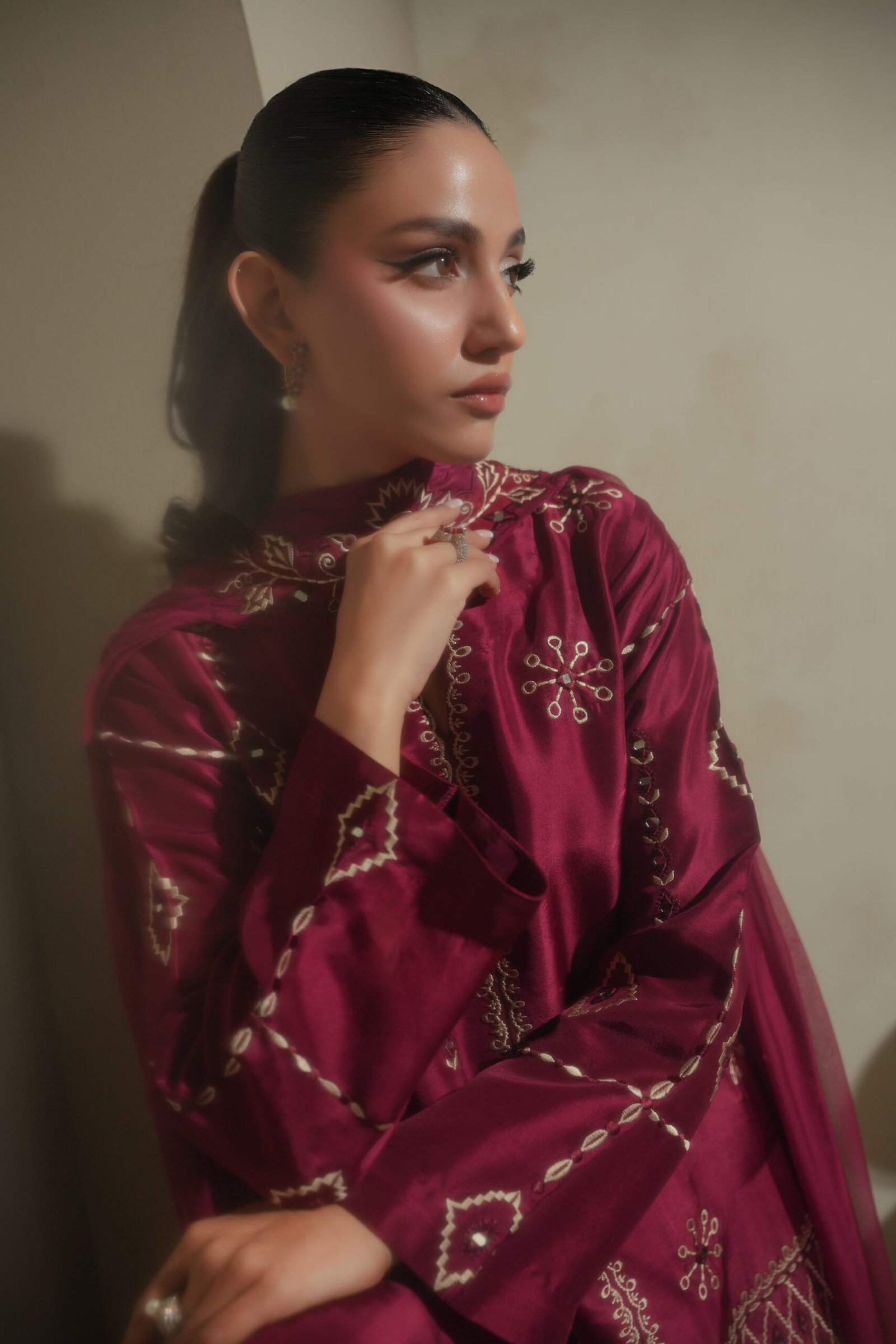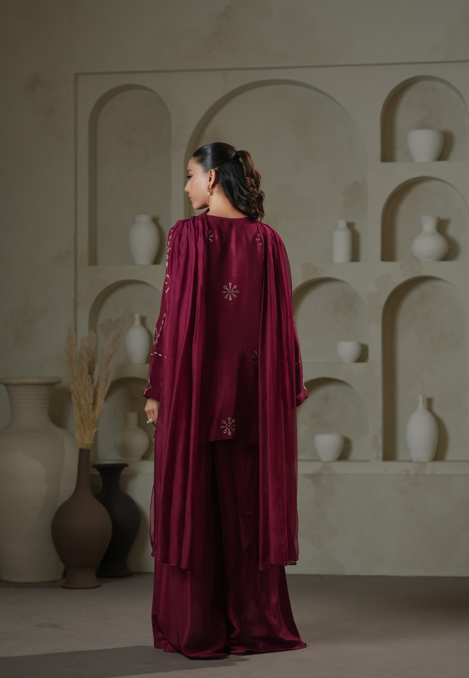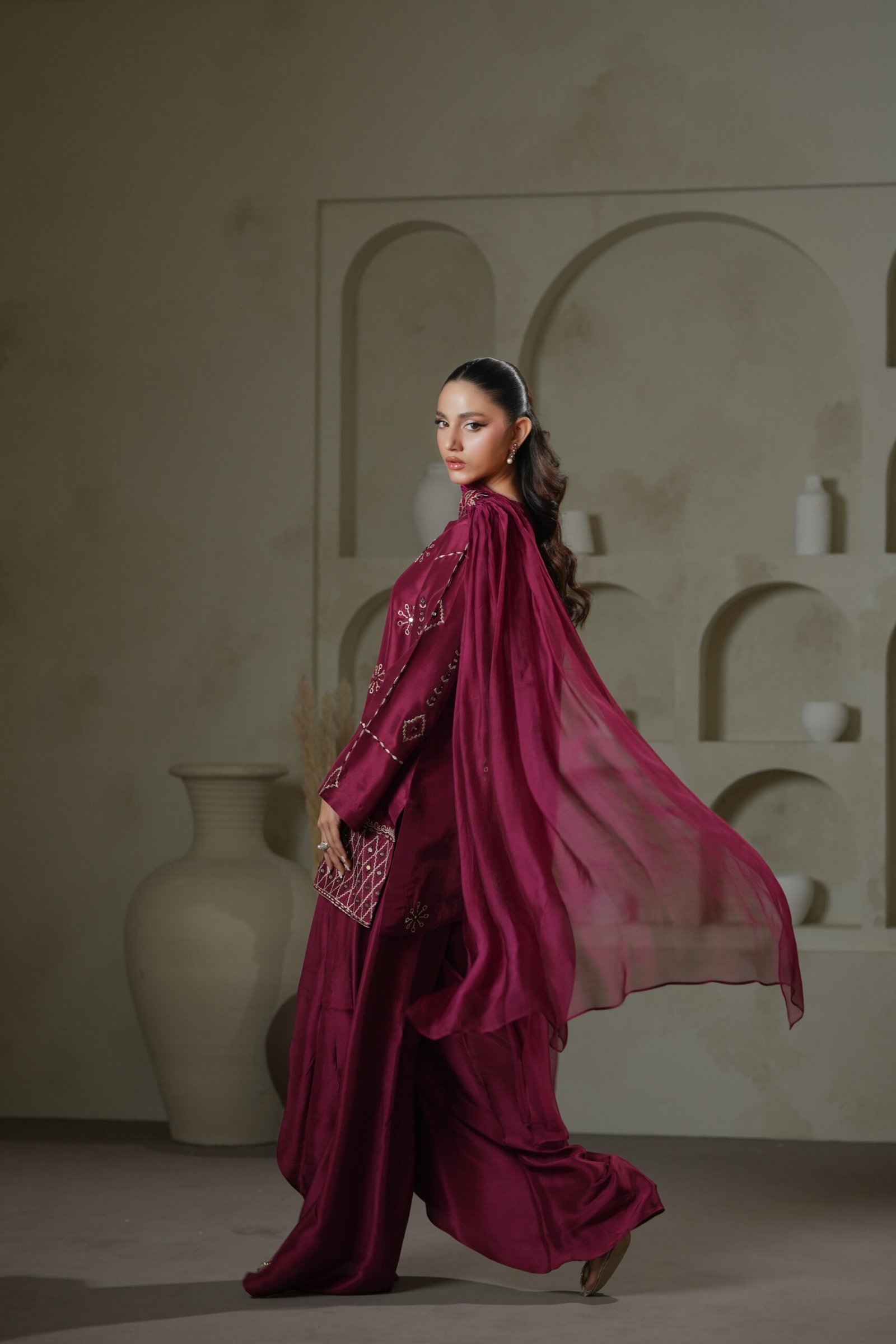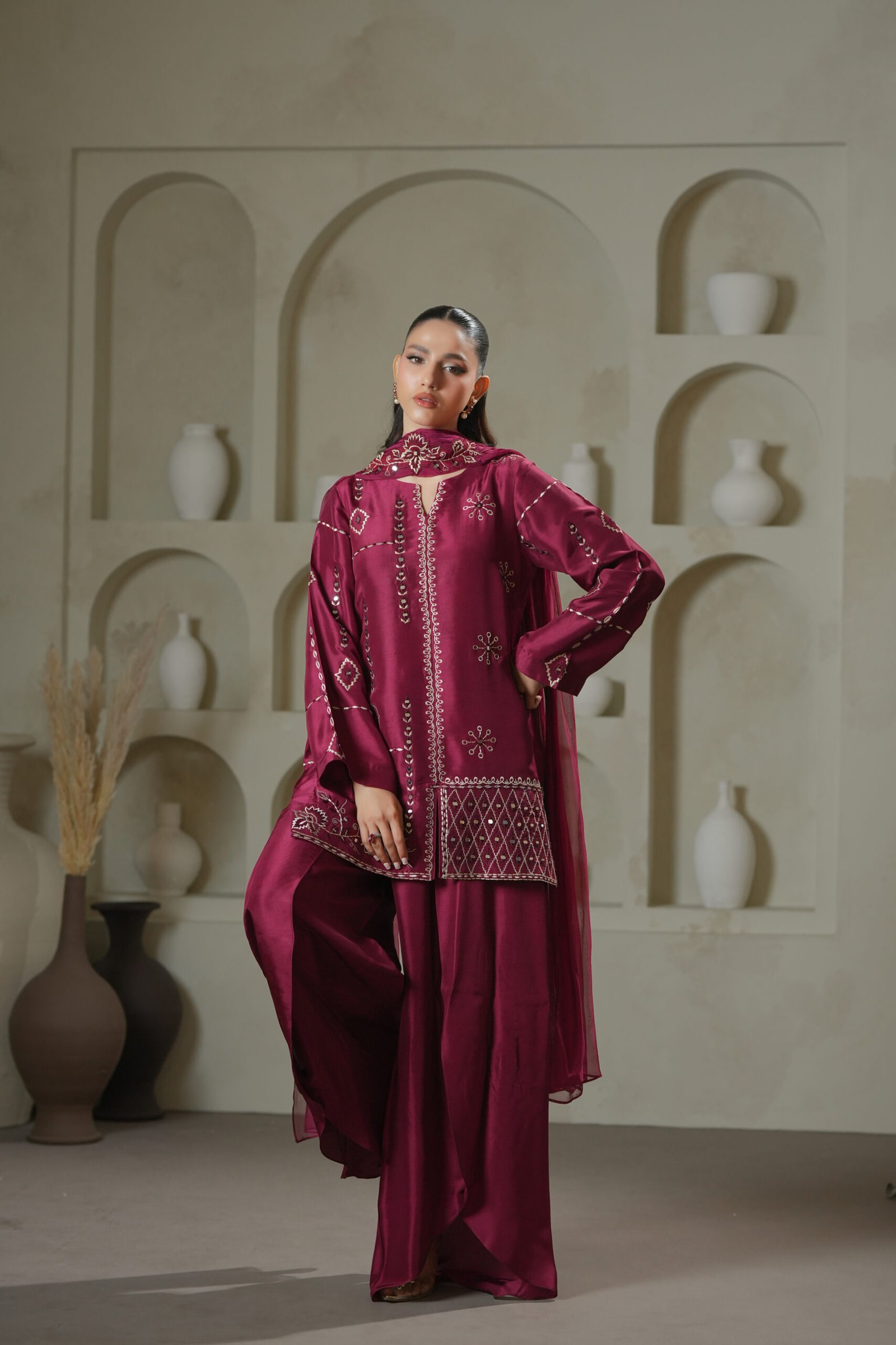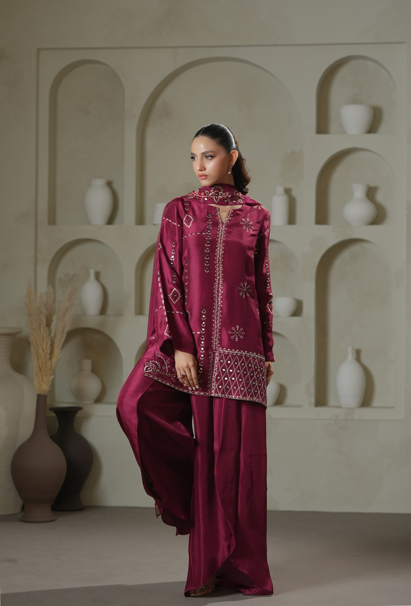 A statement in craftsmanship, this magenta short shirt features intricate mirror-work embroidery executed with precision and finesse. Paired with fluid harem pants and a dupatta finished with a handmade brooch, this ensemble celebrates artisanal detail and modern silhouette in perfect balance.