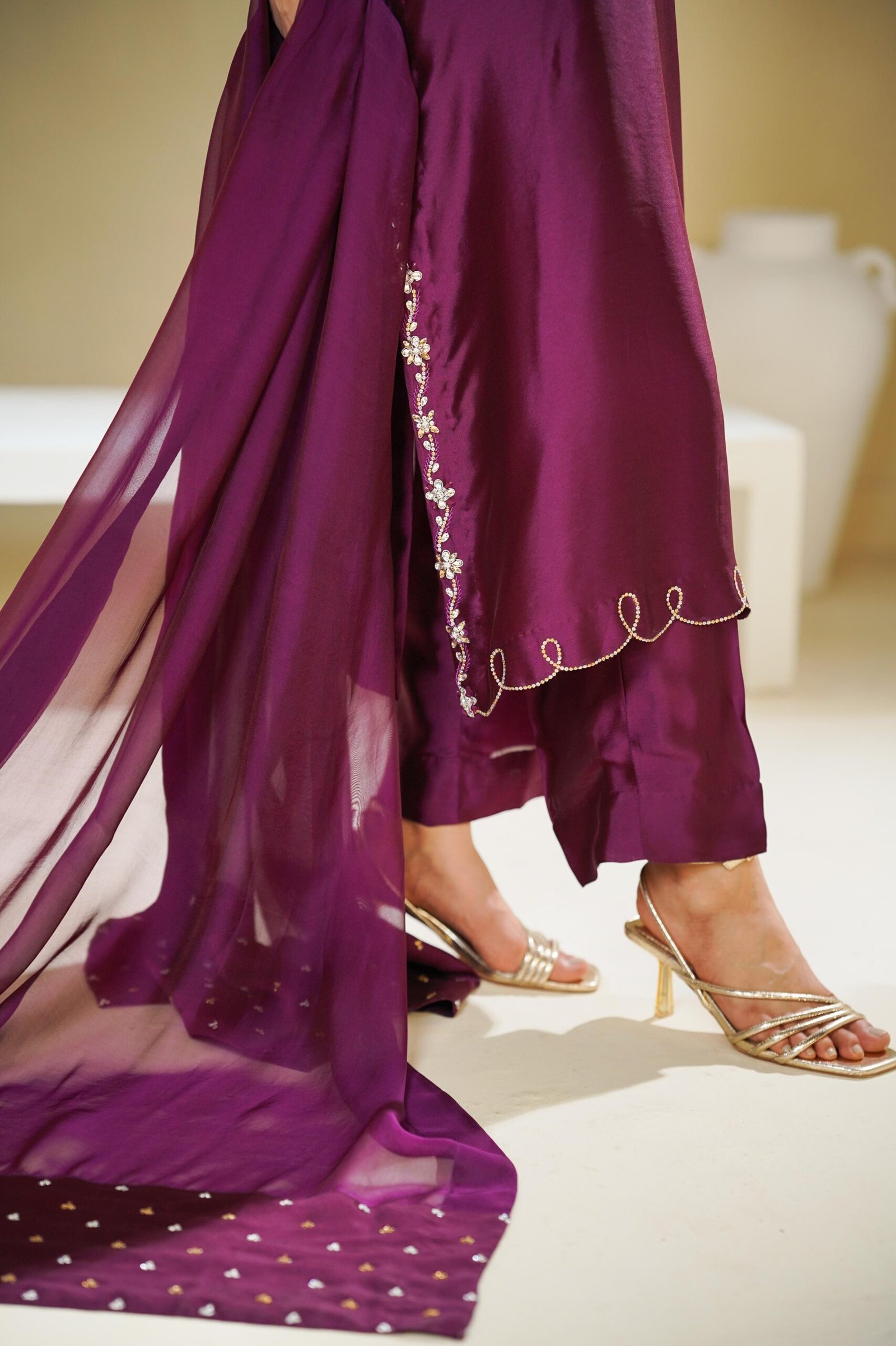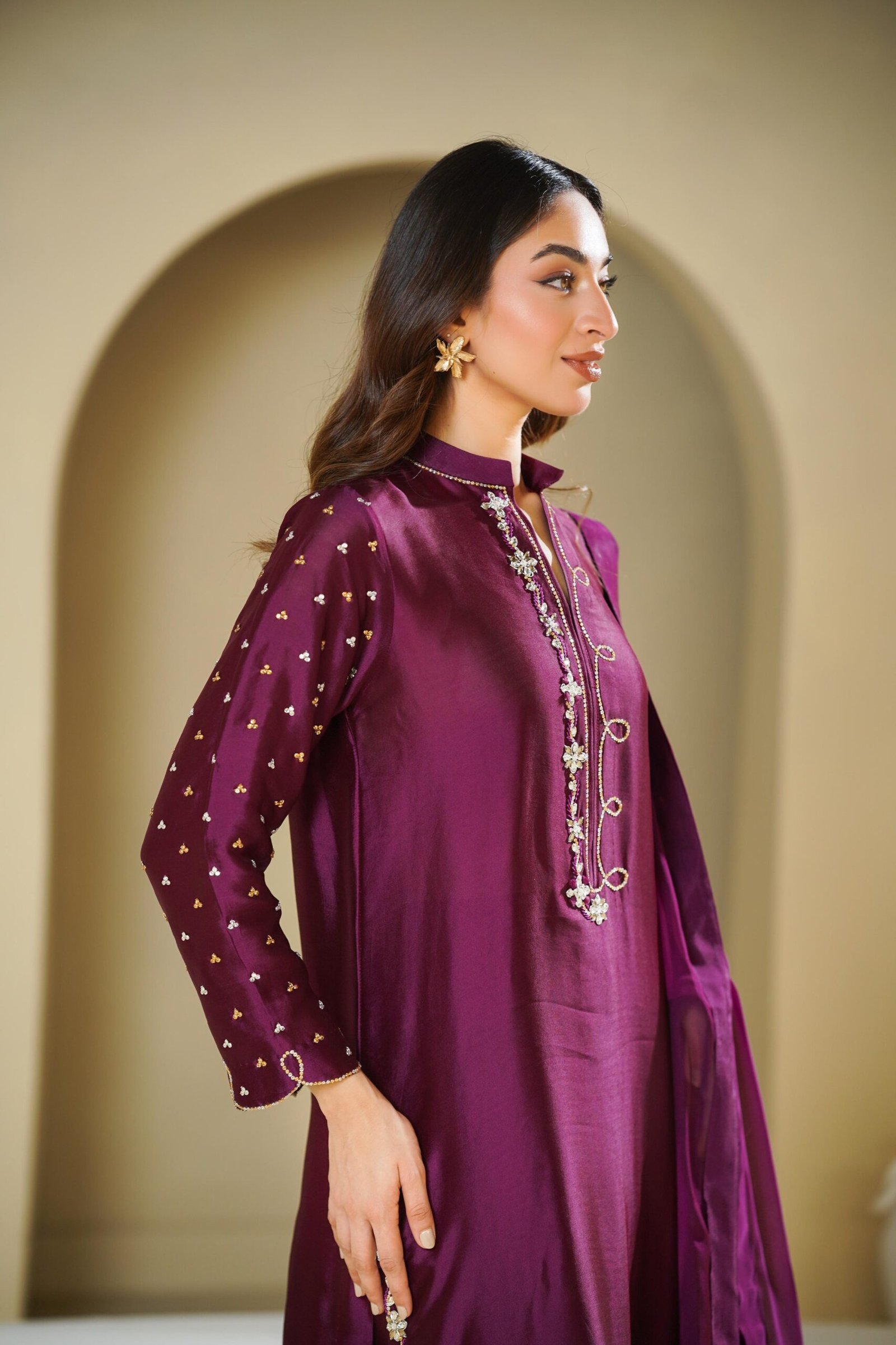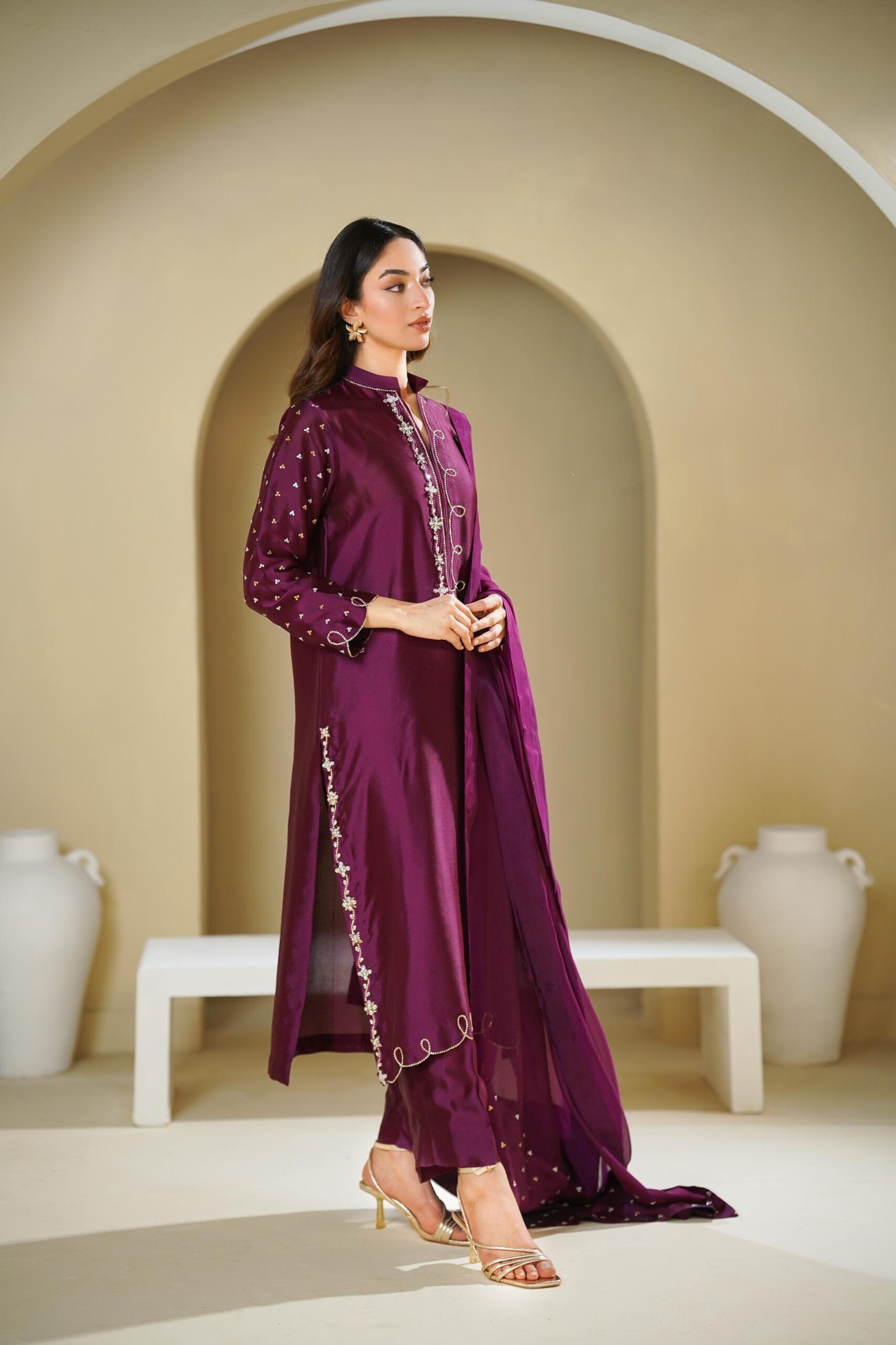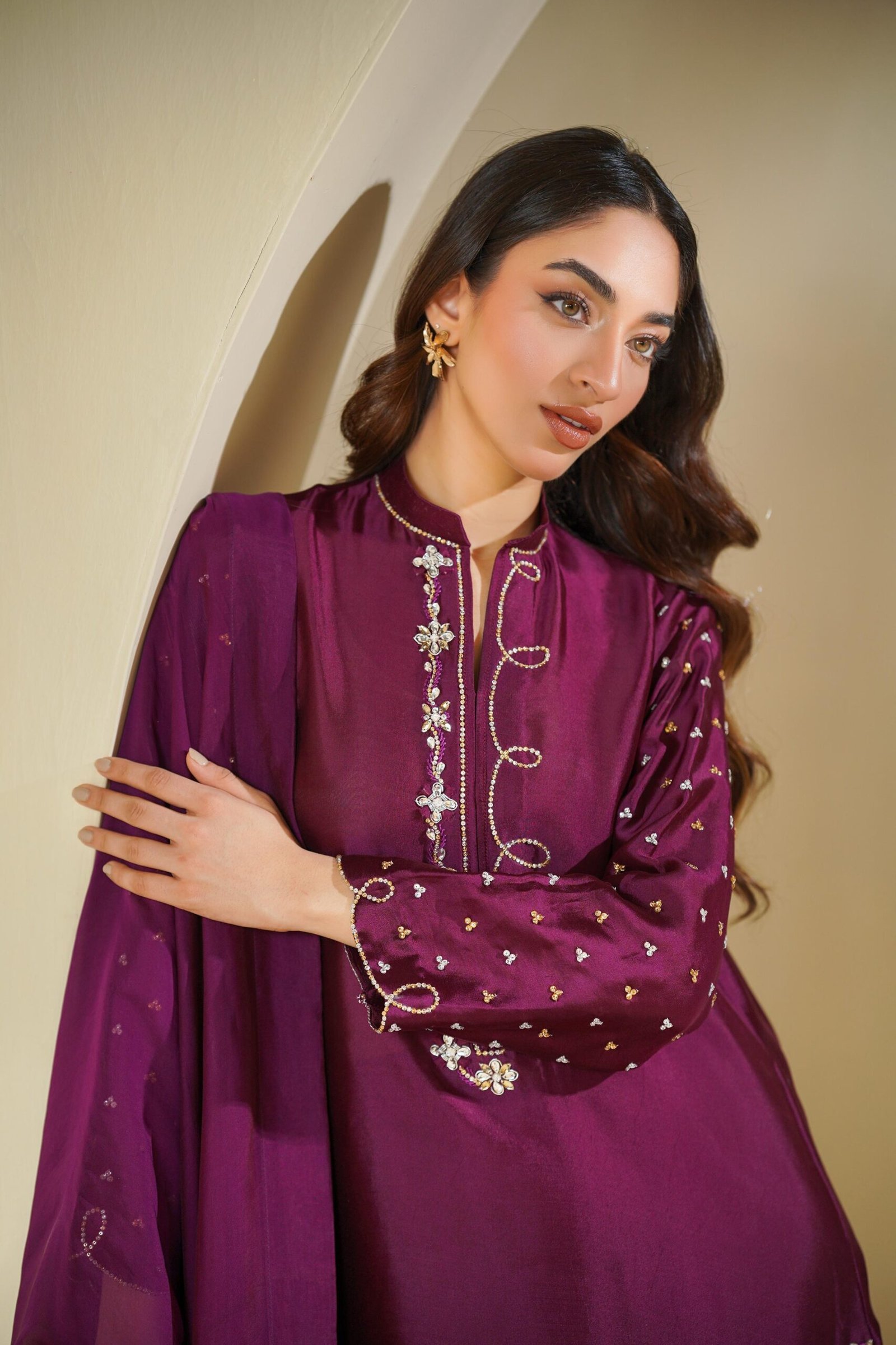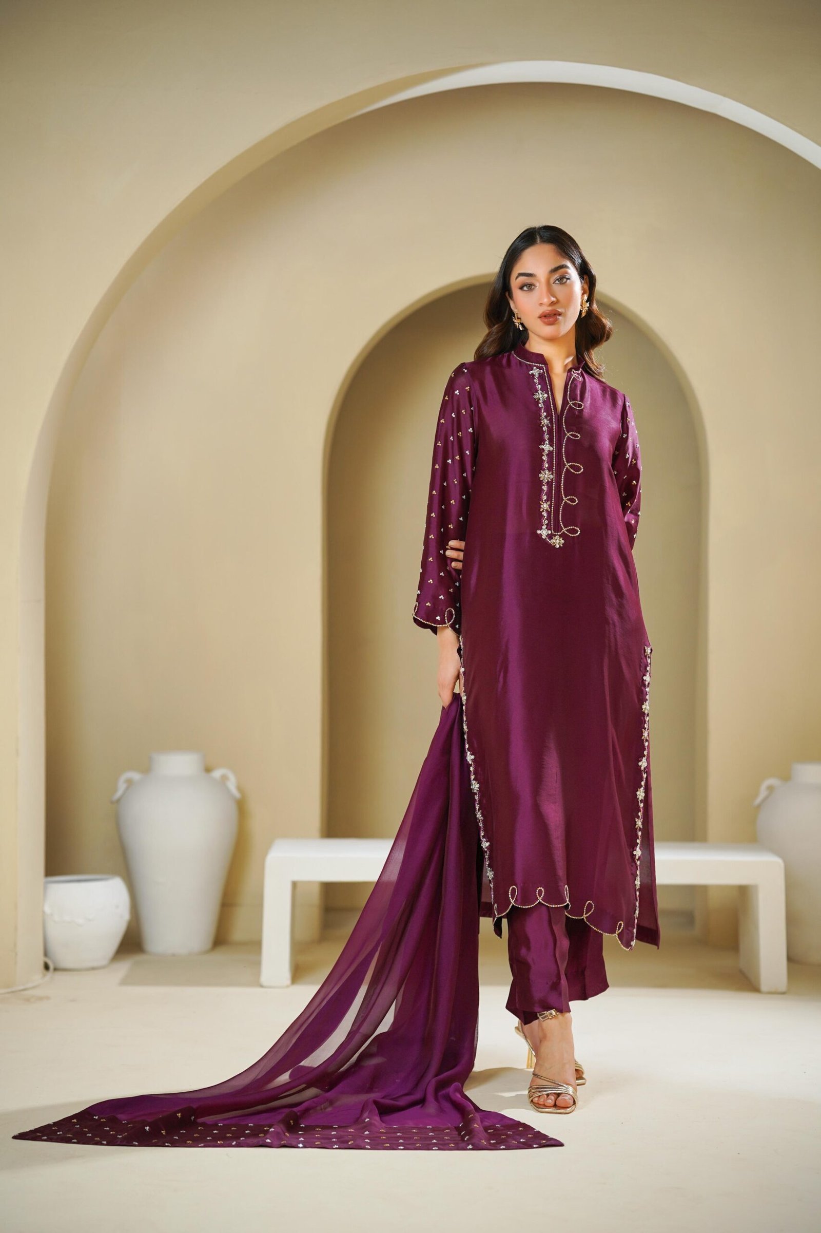 Mulberry is an artistry creation crafted from premium pure sheesha silk. This ensemble features a shirt, pant and dupatta. The design showcases intricate handwork of stones and sequence on the shirt and dupatta borders . A perfect blend of modern artistry and a timeless piece.