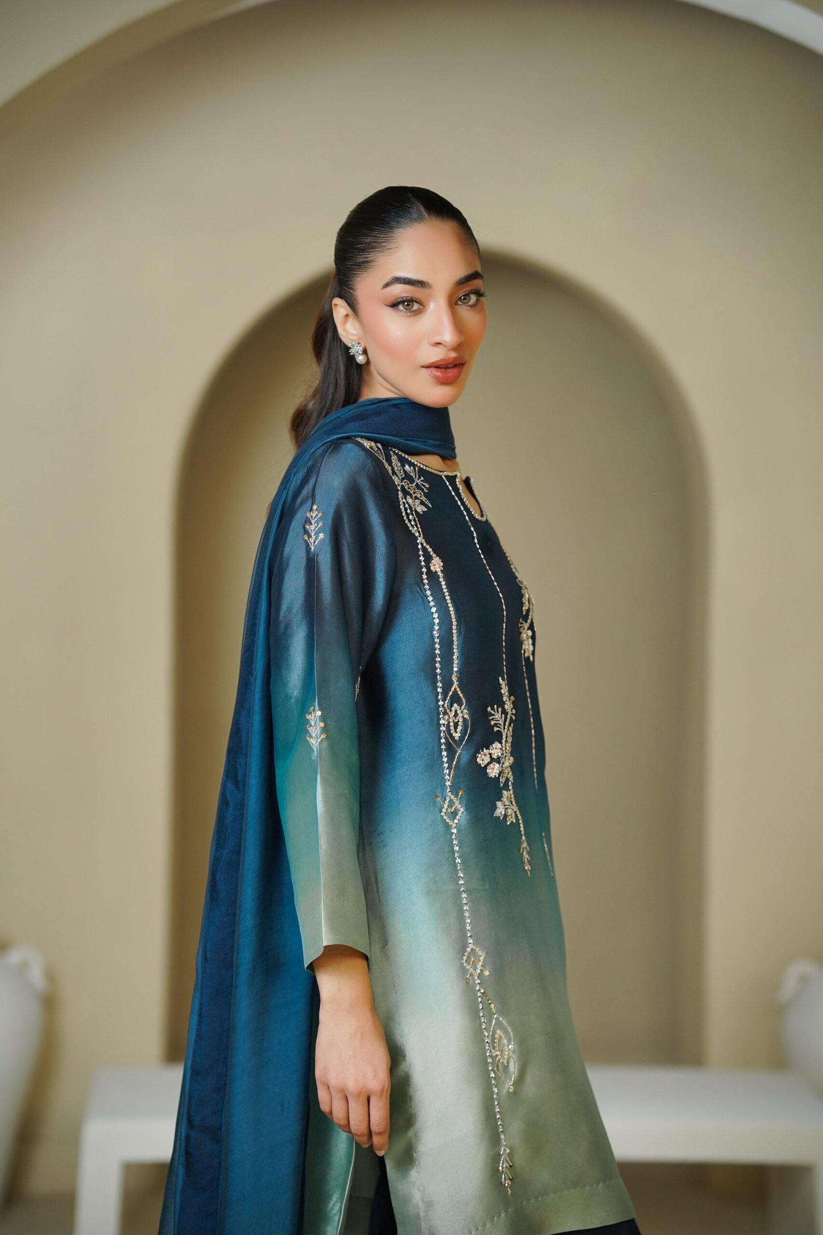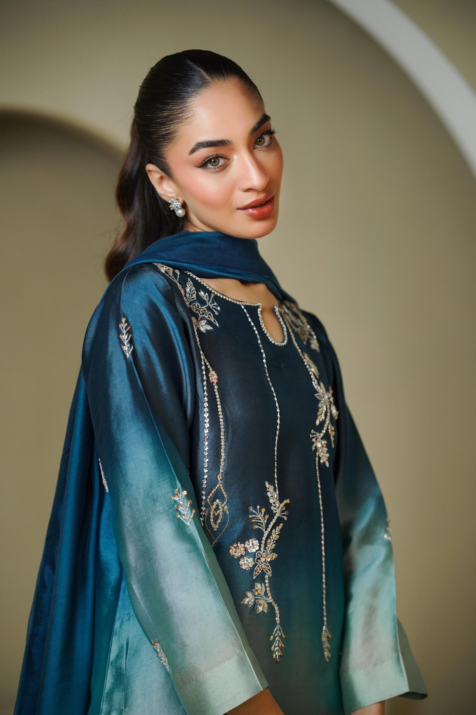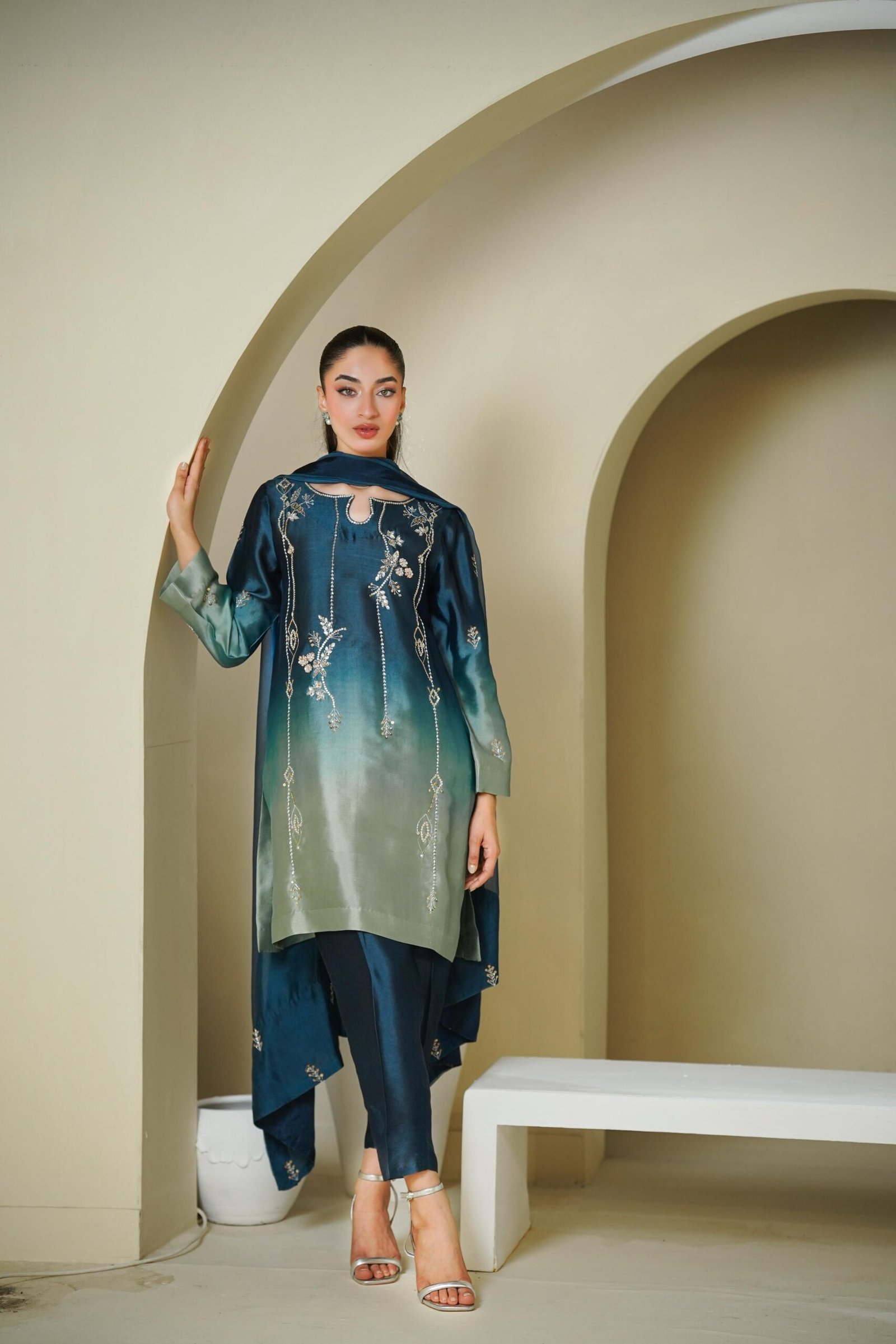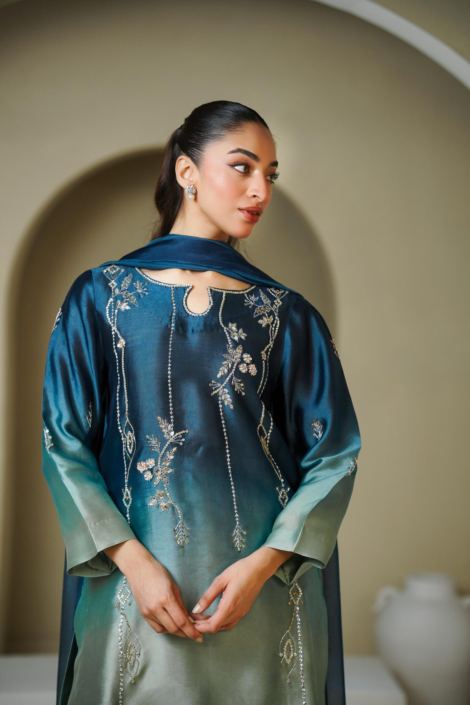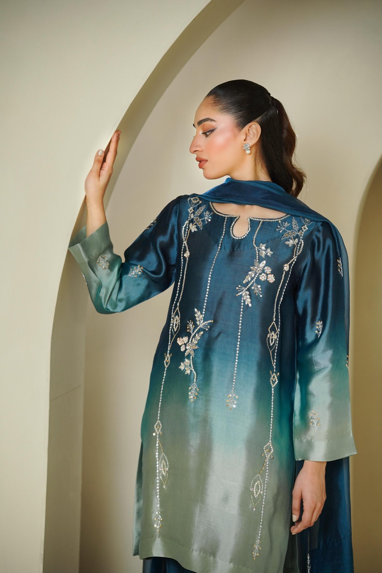 Ombré is an artistry creation crafted from premium pure sheesha silk. This ensemble features a  short shirt, shalwar and dupatta. The design showcases intricate handwork of stones and sequence on the shirt and dupatta borders . A perfect blend of modern artistry and a timeless piece.