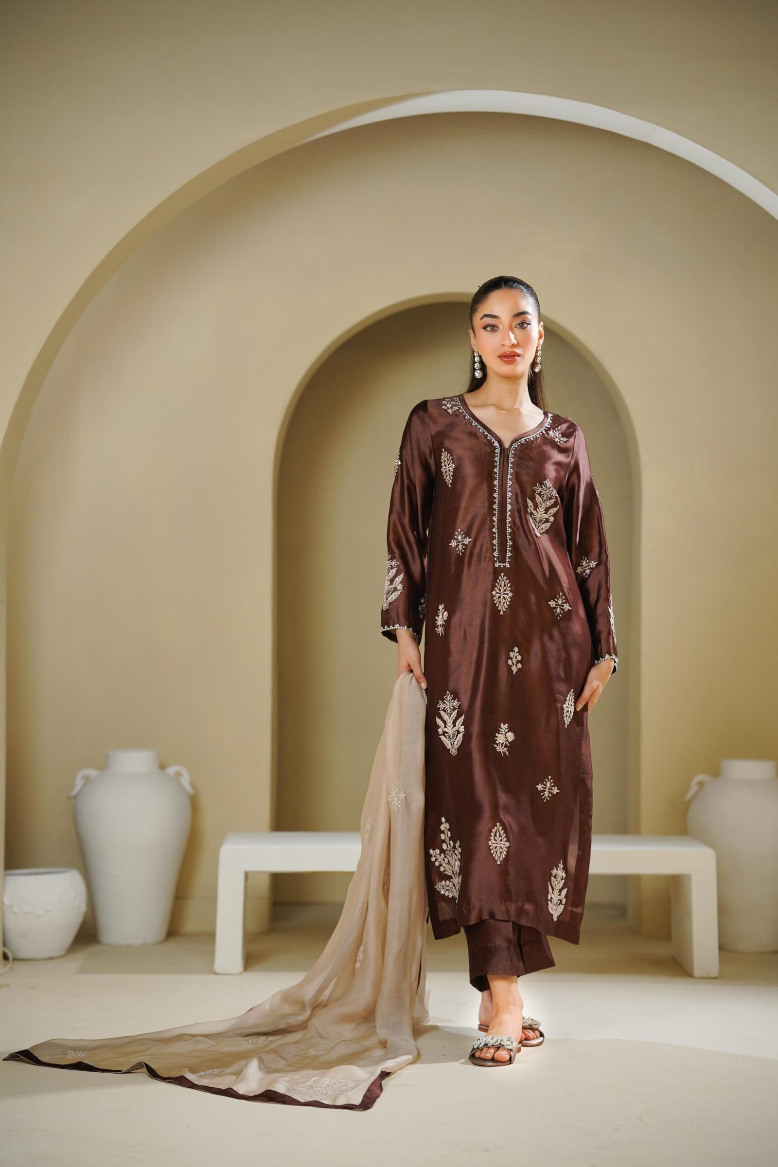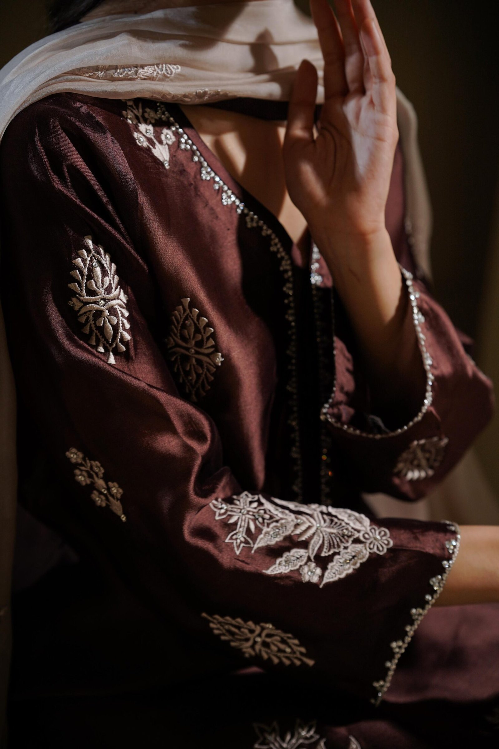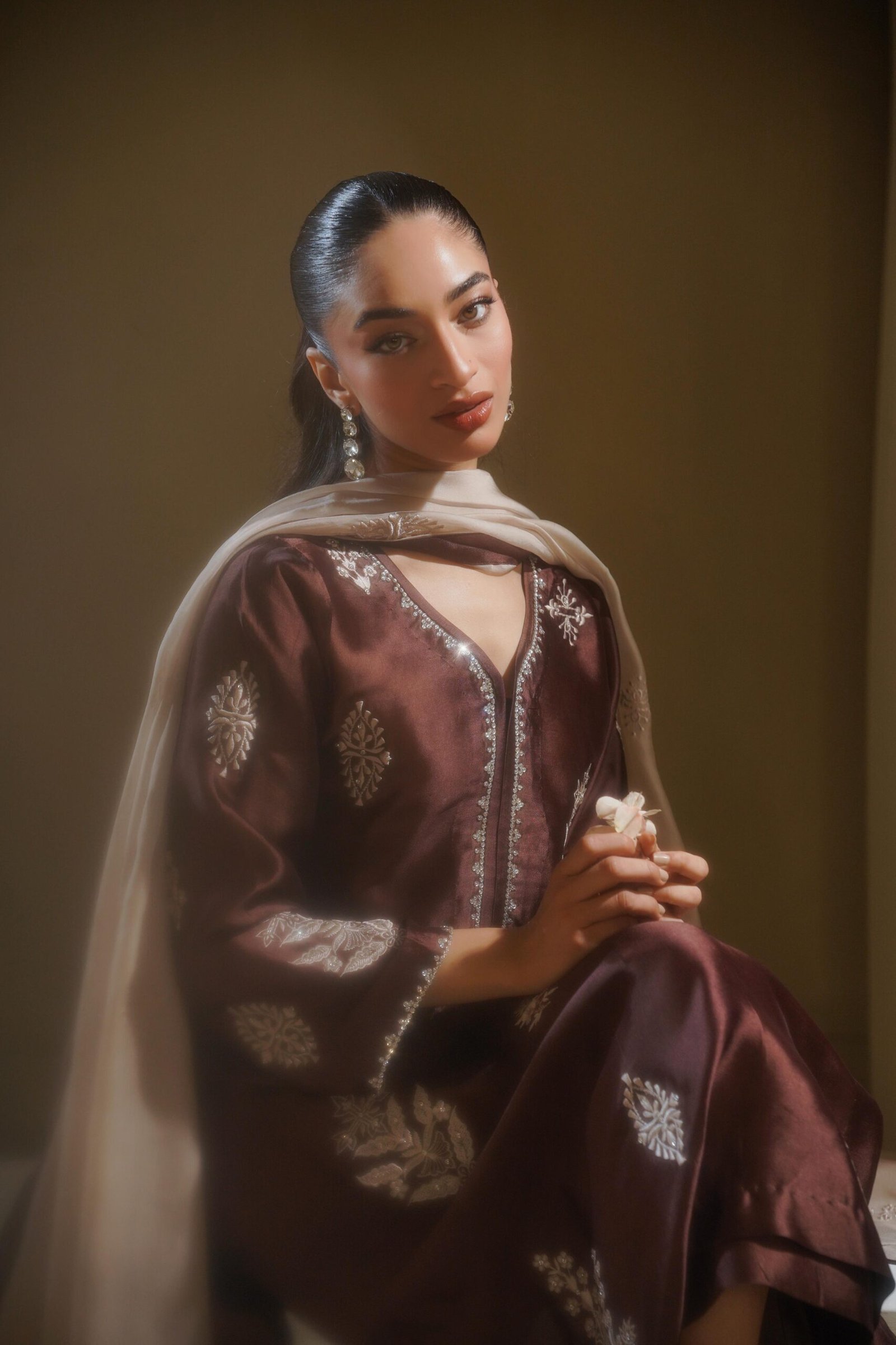 This exquisite 3-piece is made of pure sheesha silk, crafted by machine embroidery and hand work on the shirt and sleeves. The dupatta is in contrast to our colour palette and is made of sheesha organza with machine embroidery. Perfect outfit for every festive occasion.