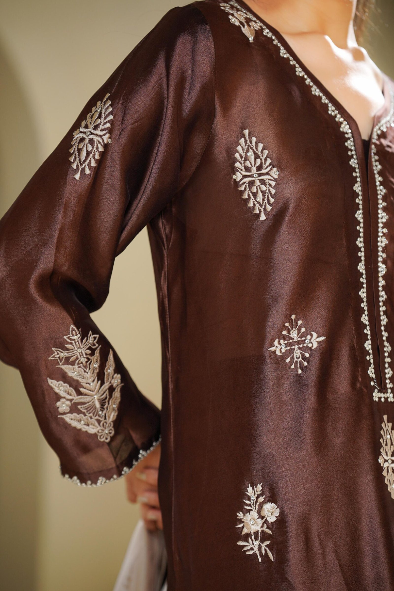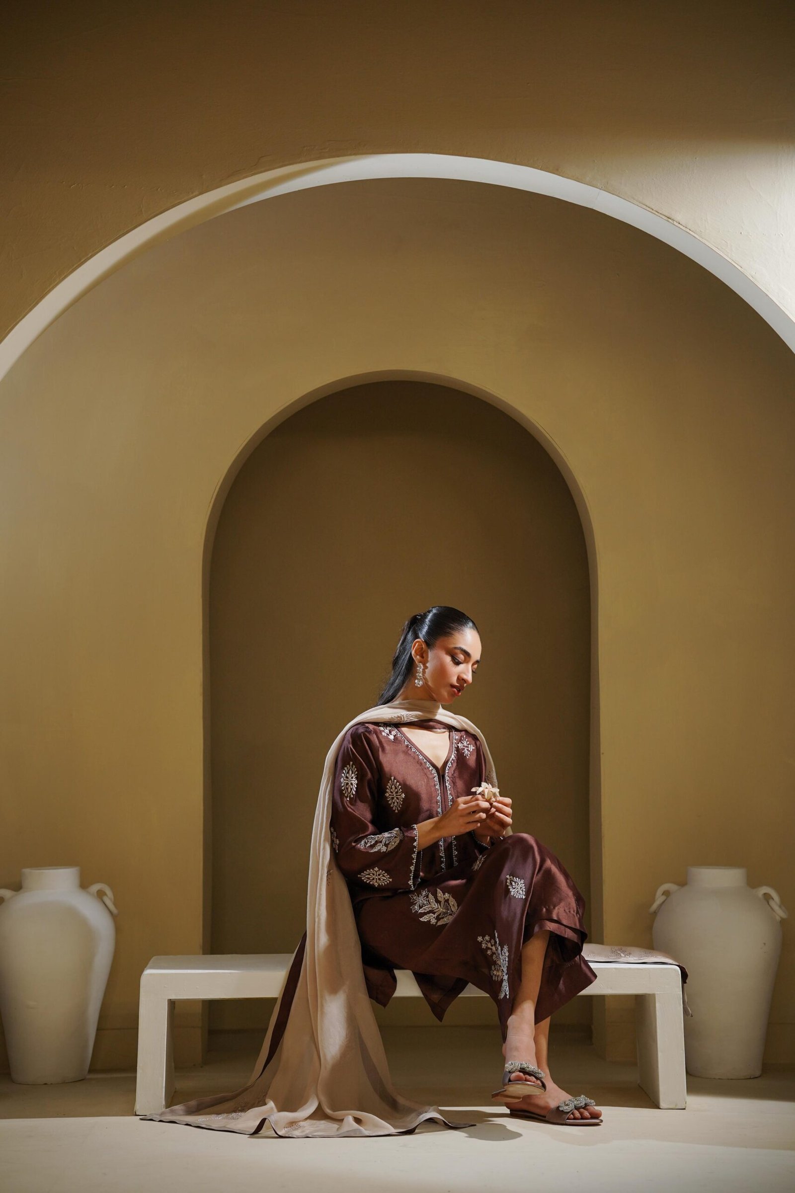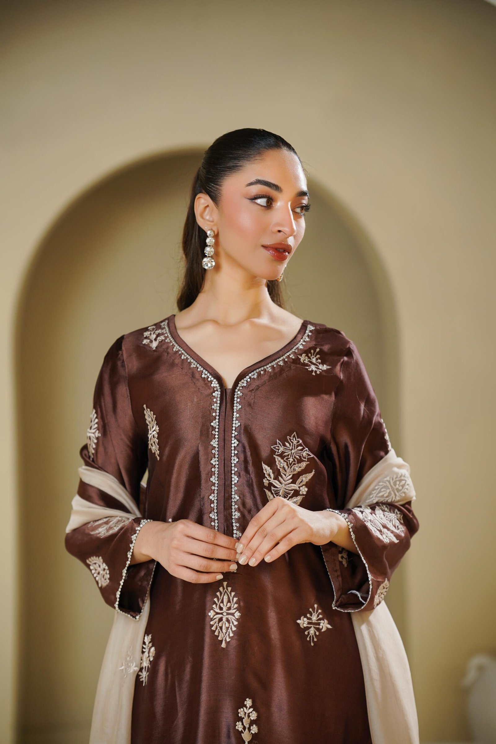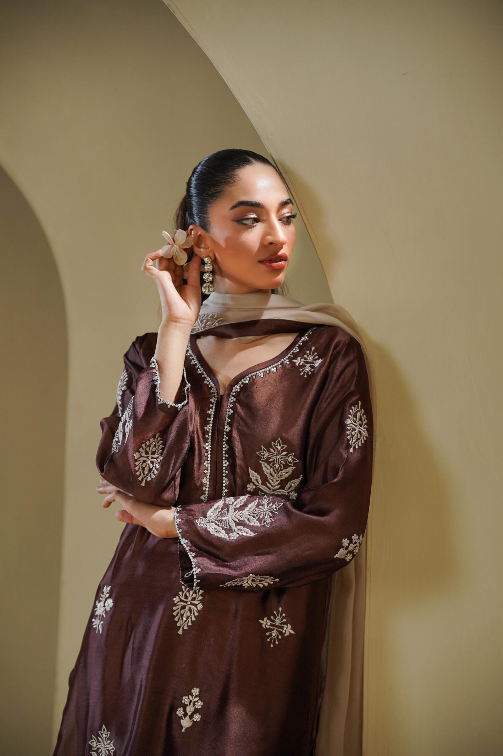 This exquisite 3-piece is made of pure sheesha silk, crafted by machine embroidery and hand work on the shirt and sleeves. The dupatta is in contrast to our colour palette and is made of sheesha organza with machine embroidery. Perfect outfit for every festive occasion.