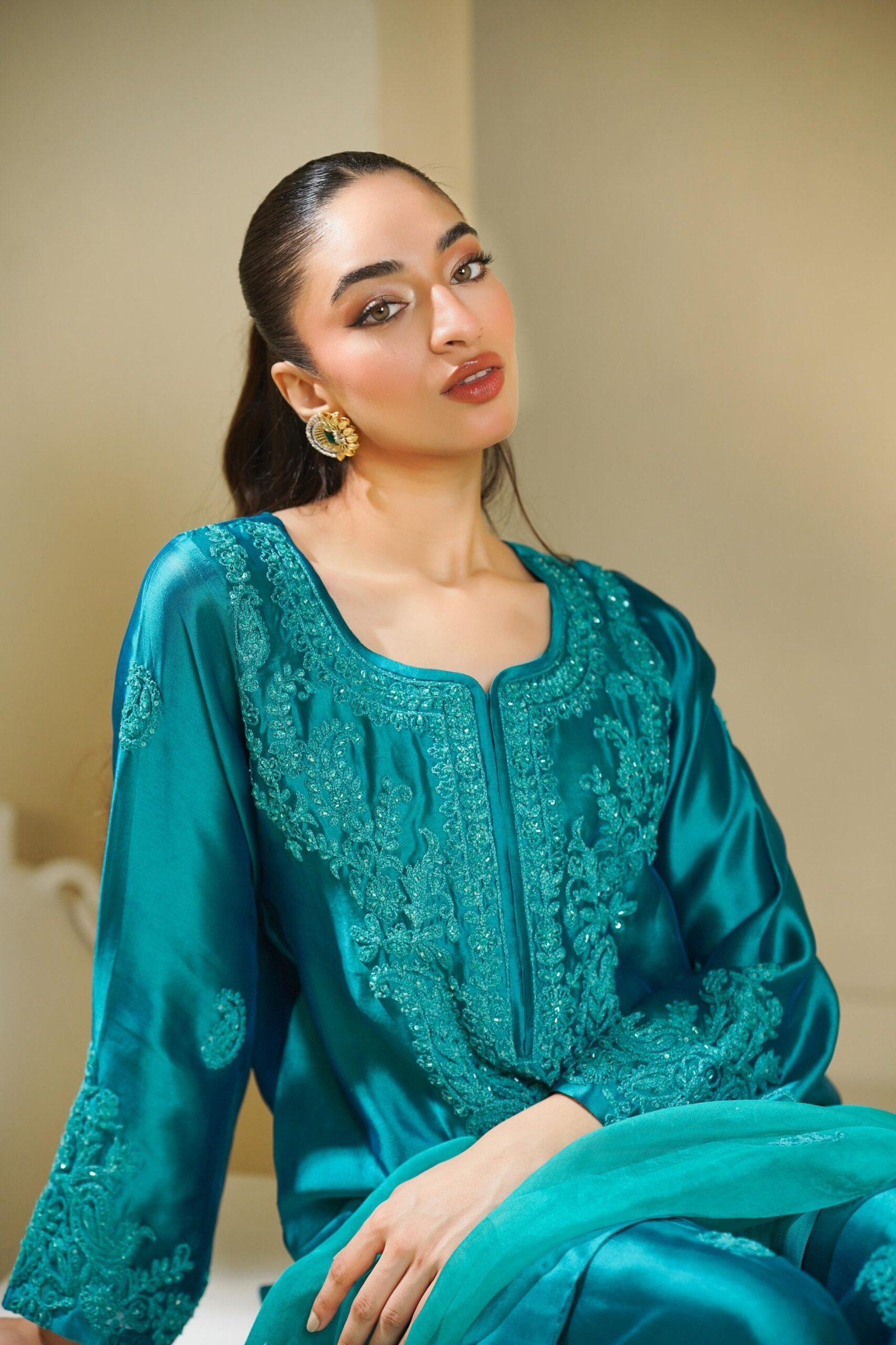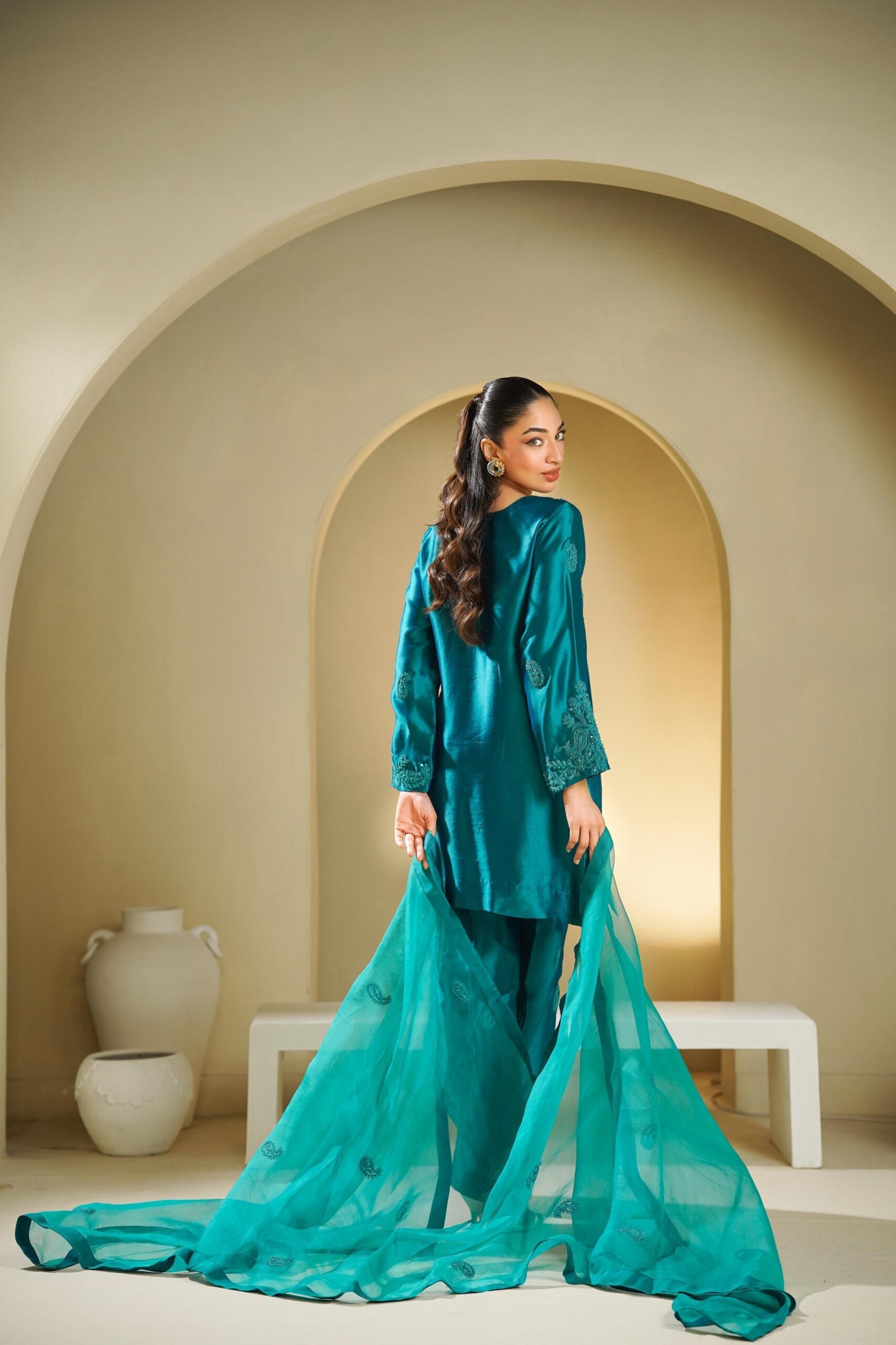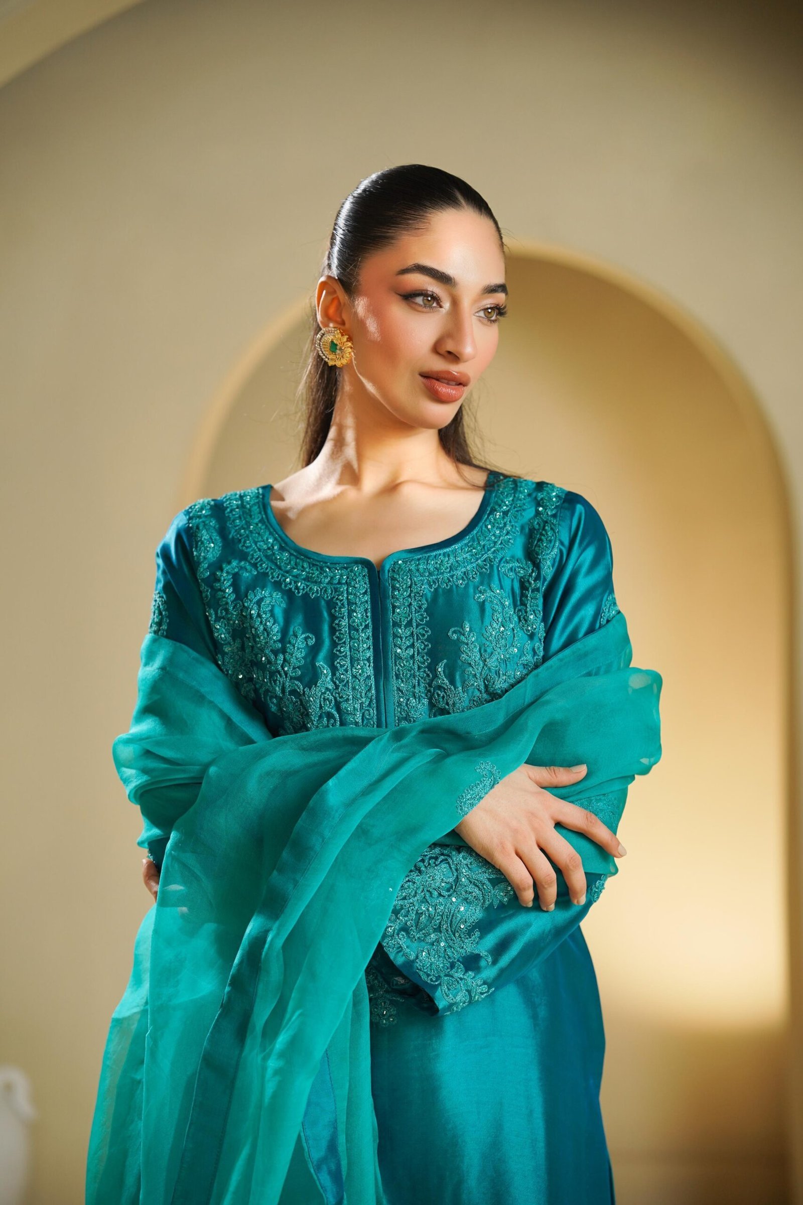 This exquisite teal Eastern wear ensemble, beautifully crafted to reflect traditional charm with a modern twist. The outfit features a rich teal base adorned with intricate ankhor and cut dana handwork, adding a touch of shimmer and delicate texture to the fabric. Complementing the outfit is a soft light teal contrast dupatta, adding a refreshing balance to the deeper tones of the ensemble. The embroidery is thoughtfully placed to enhance the silhouette, creating a regal yet graceful look.