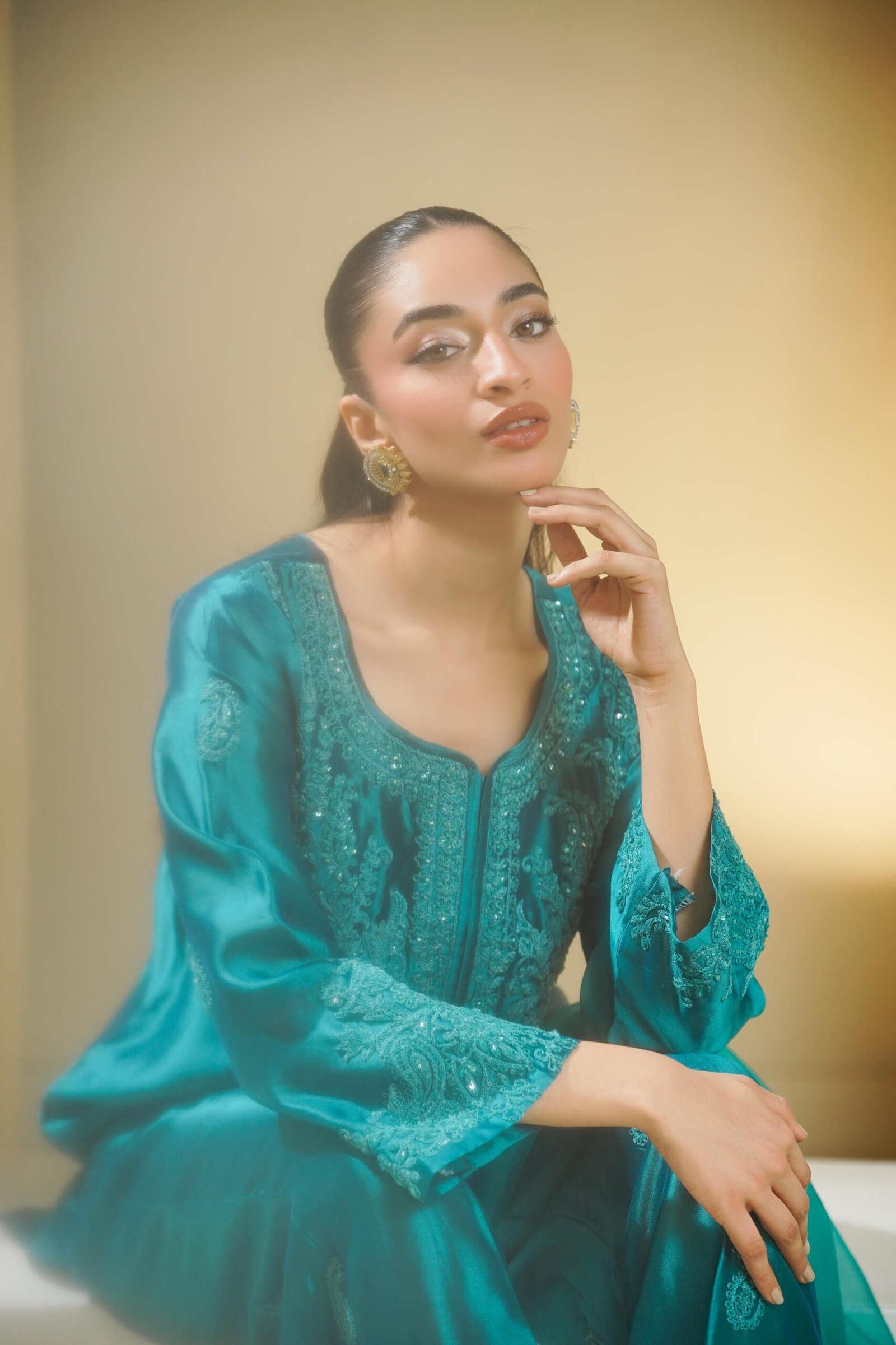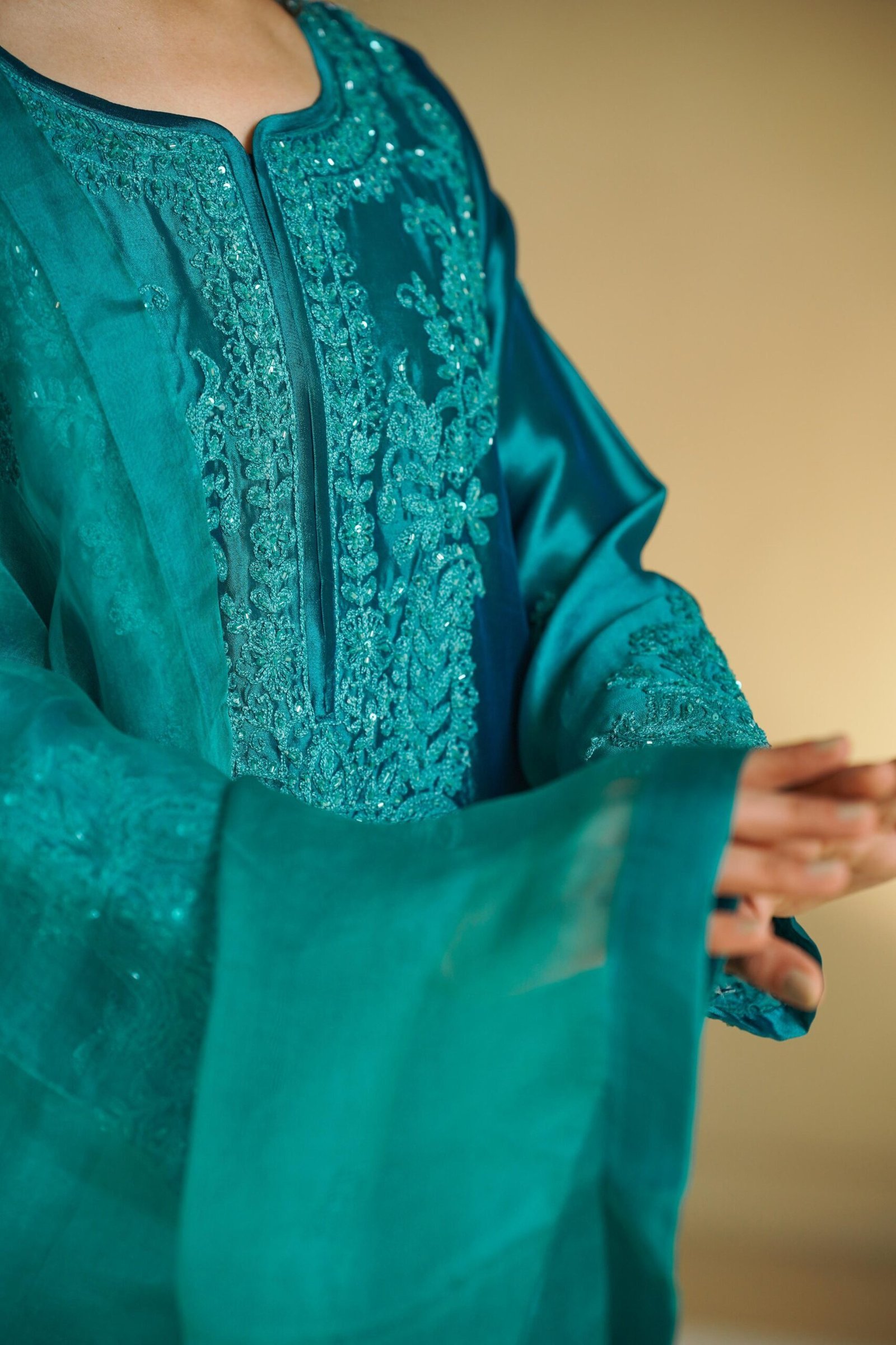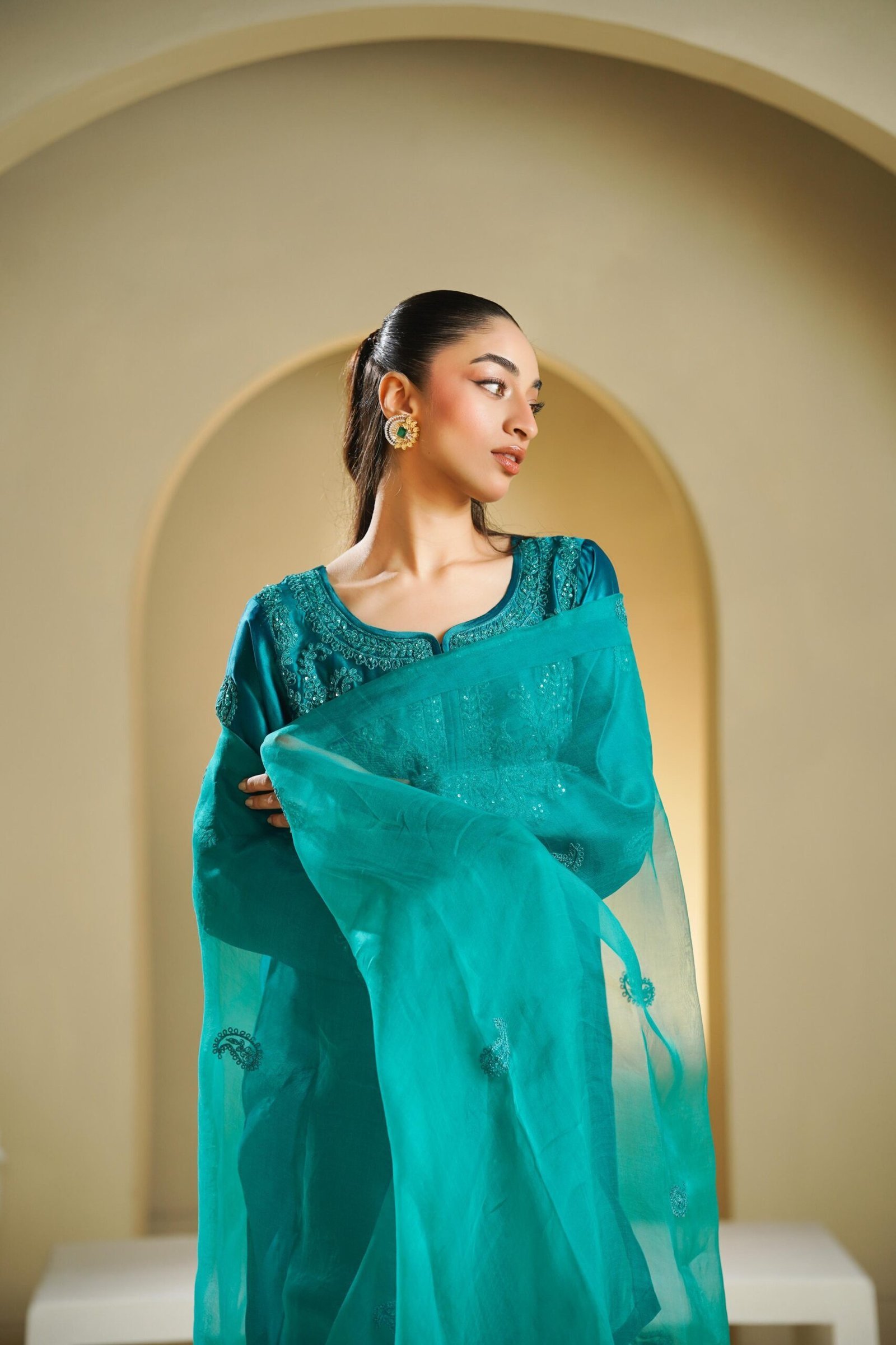 This exquisite teal Eastern wear ensemble, beautifully crafted to reflect traditional charm with a modern twist. The outfit features a rich teal base adorned with intricate ankhor and cut dana handwork, adding a touch of shimmer and delicate texture to the fabric. Complementing the outfit is a soft light teal contrast dupatta, adding a refreshing balance to the deeper tones of the ensemble. The embroidery is thoughtfully placed to enhance the silhouette, creating a regal yet graceful look.