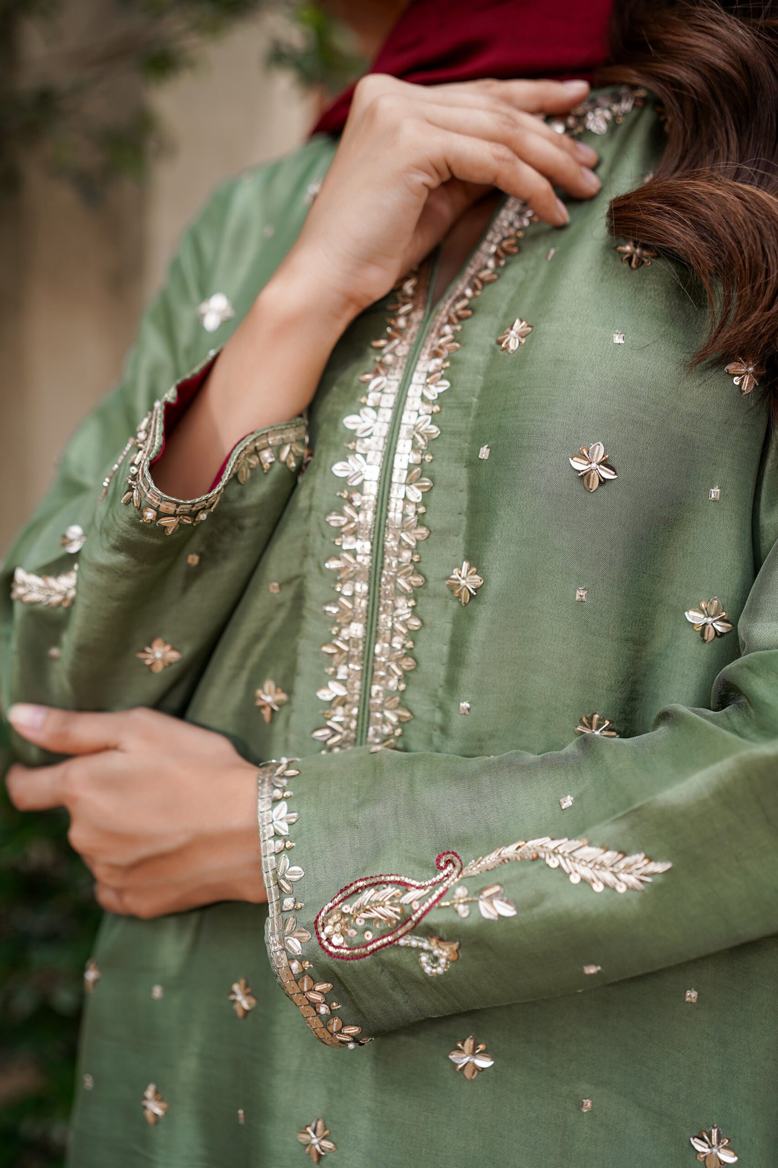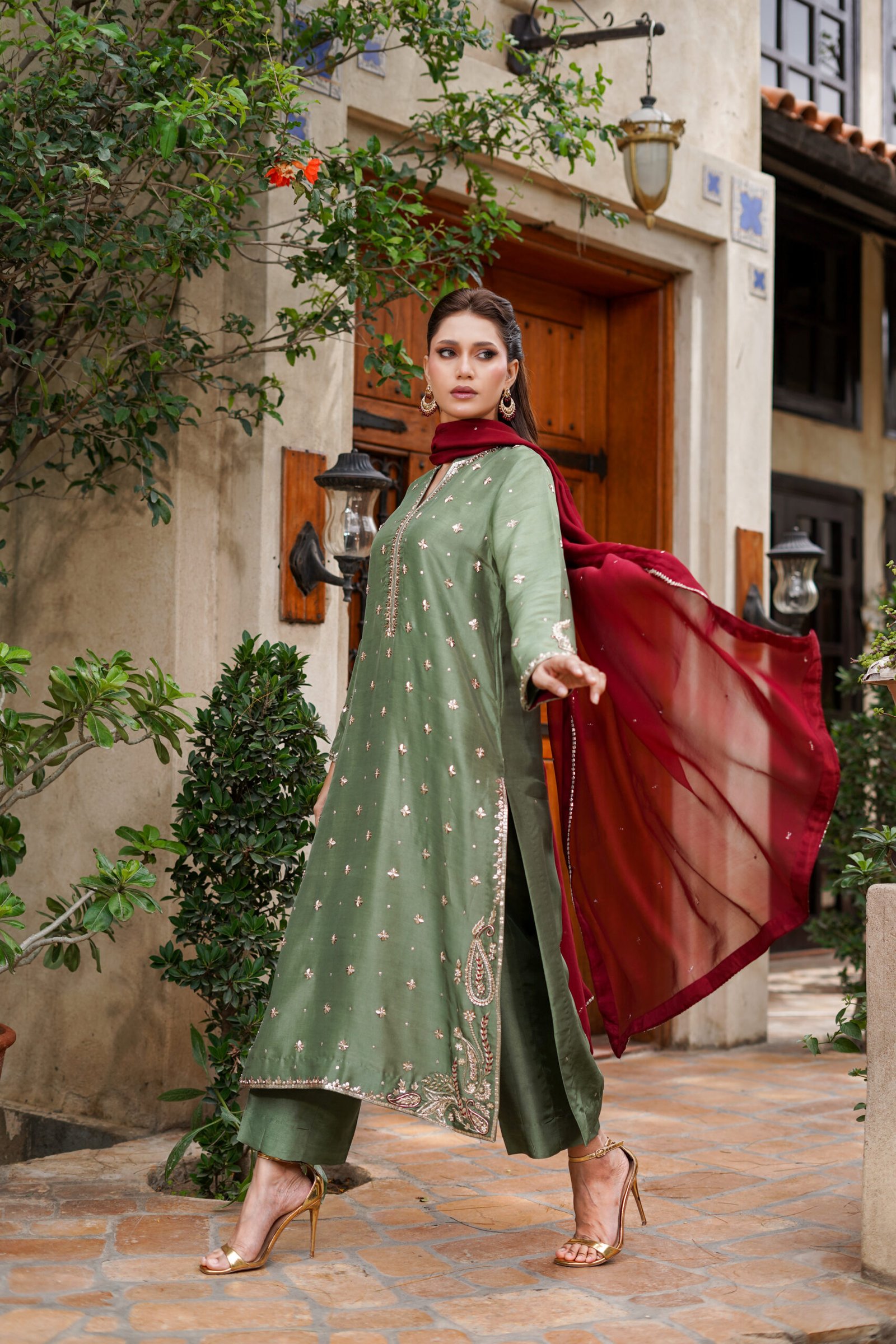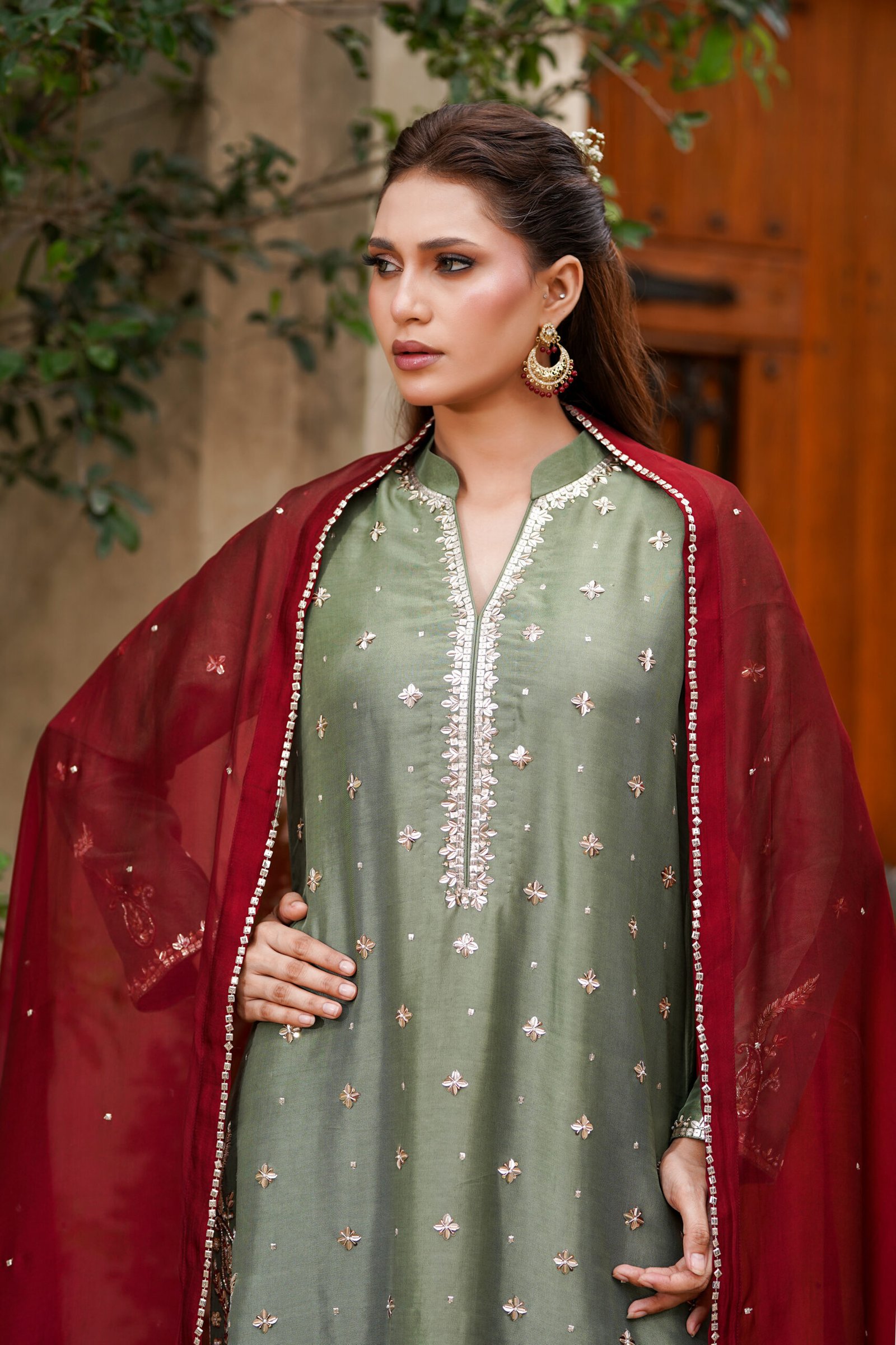 A timeless harmony of deep olive and regal maroon, Verda is adorned with golden pita work and layered stone embellishments. Intricate craftsmanship meets delicate detailing, creating a look that embodies both tradition and luxury.