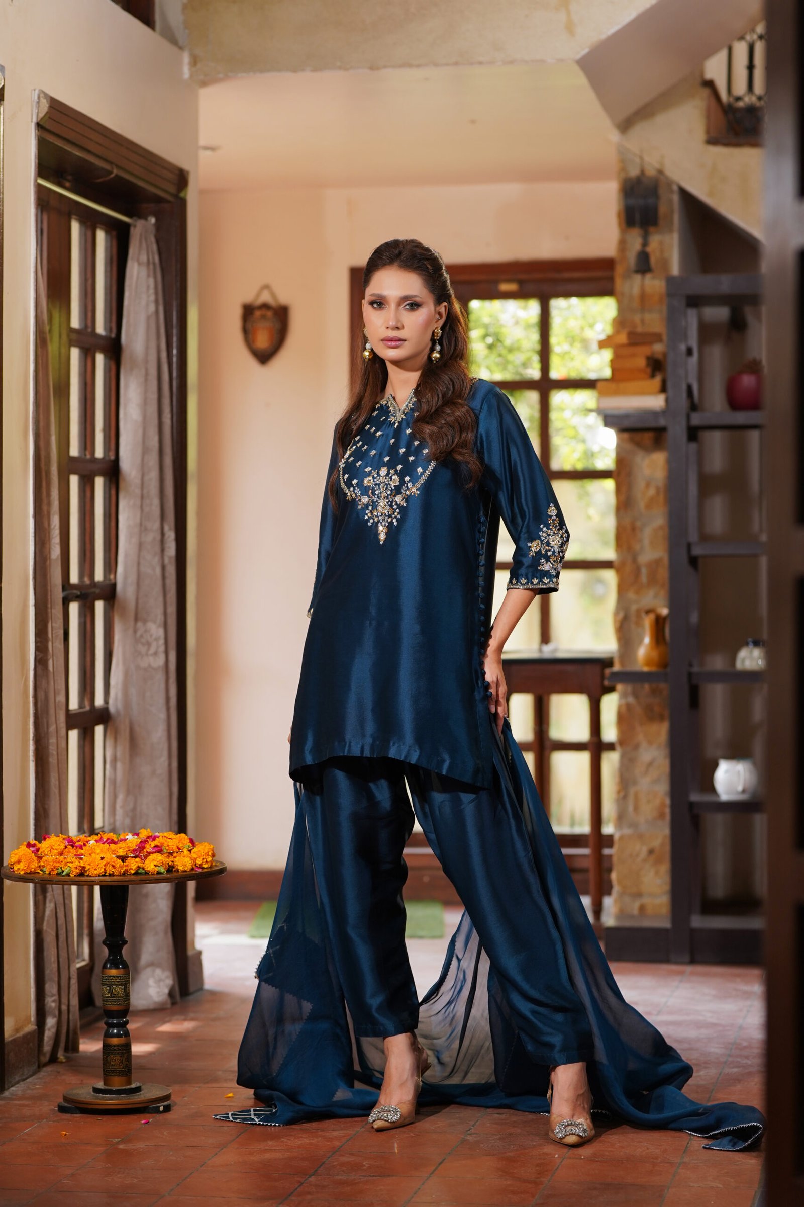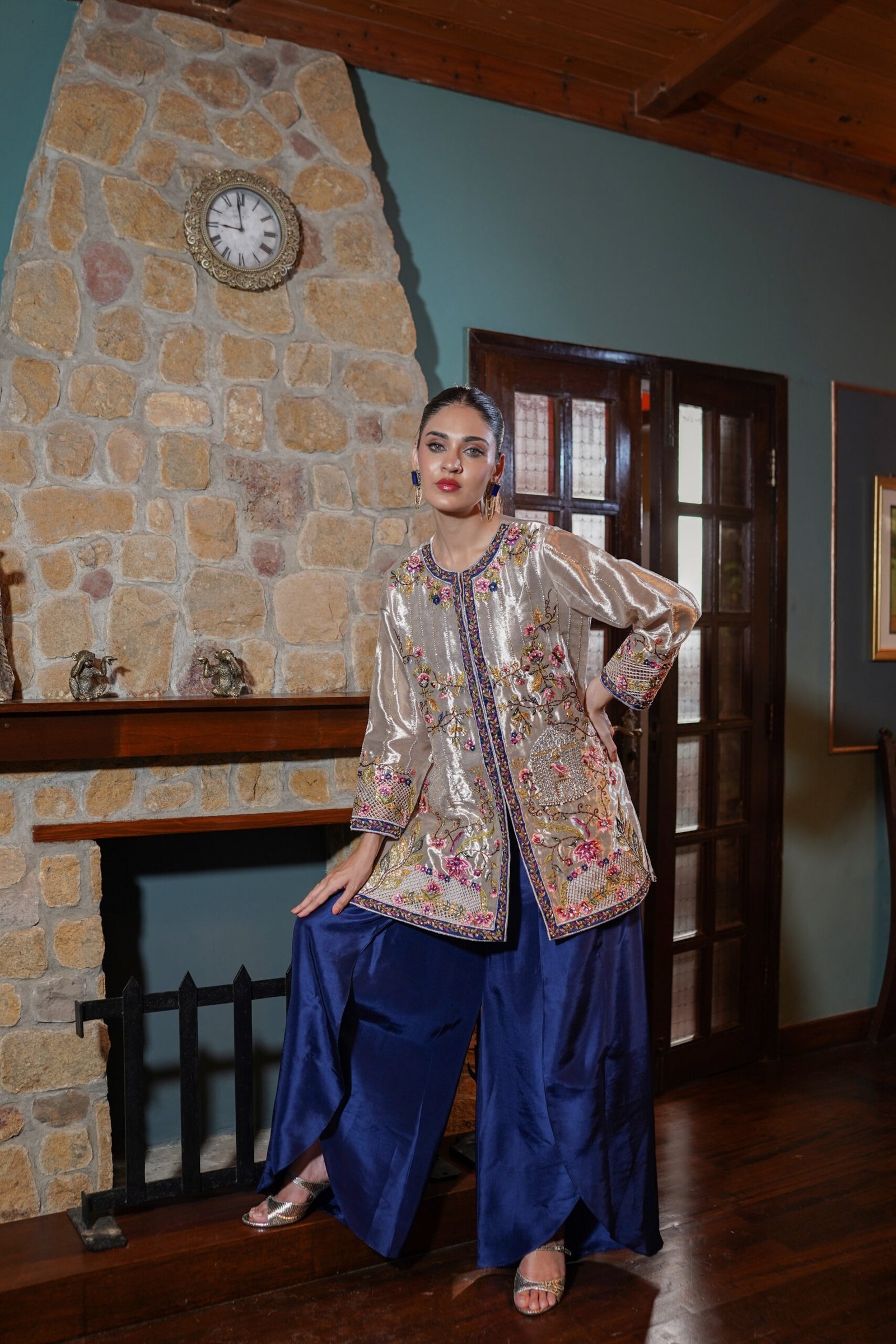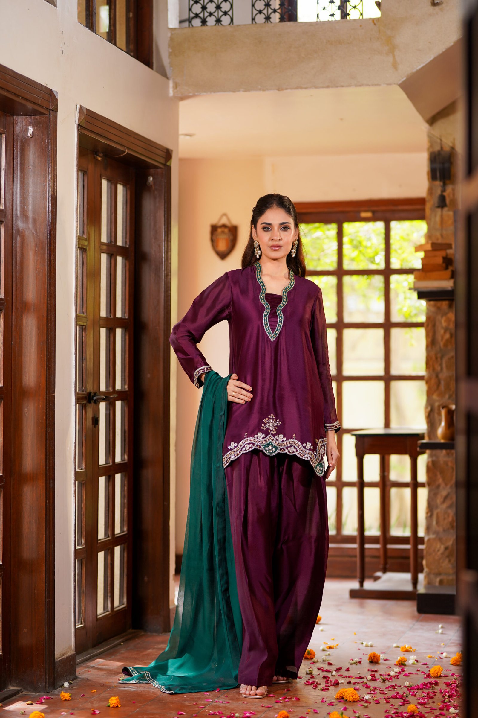 A timeless harmony of deep olive and regal maroon, Verda is adorned with golden pita work and layered stone embellishments. Intricate craftsmanship meets delicate detailing, creating a look that embodies both tradition and luxury.